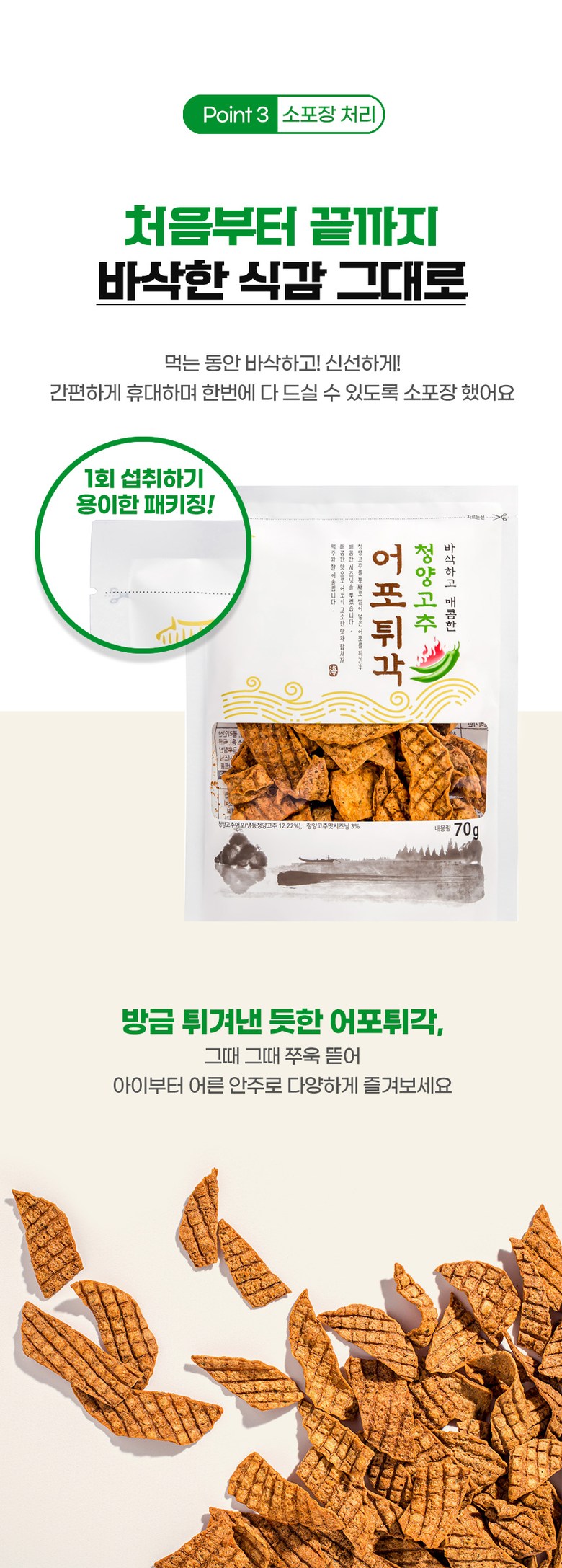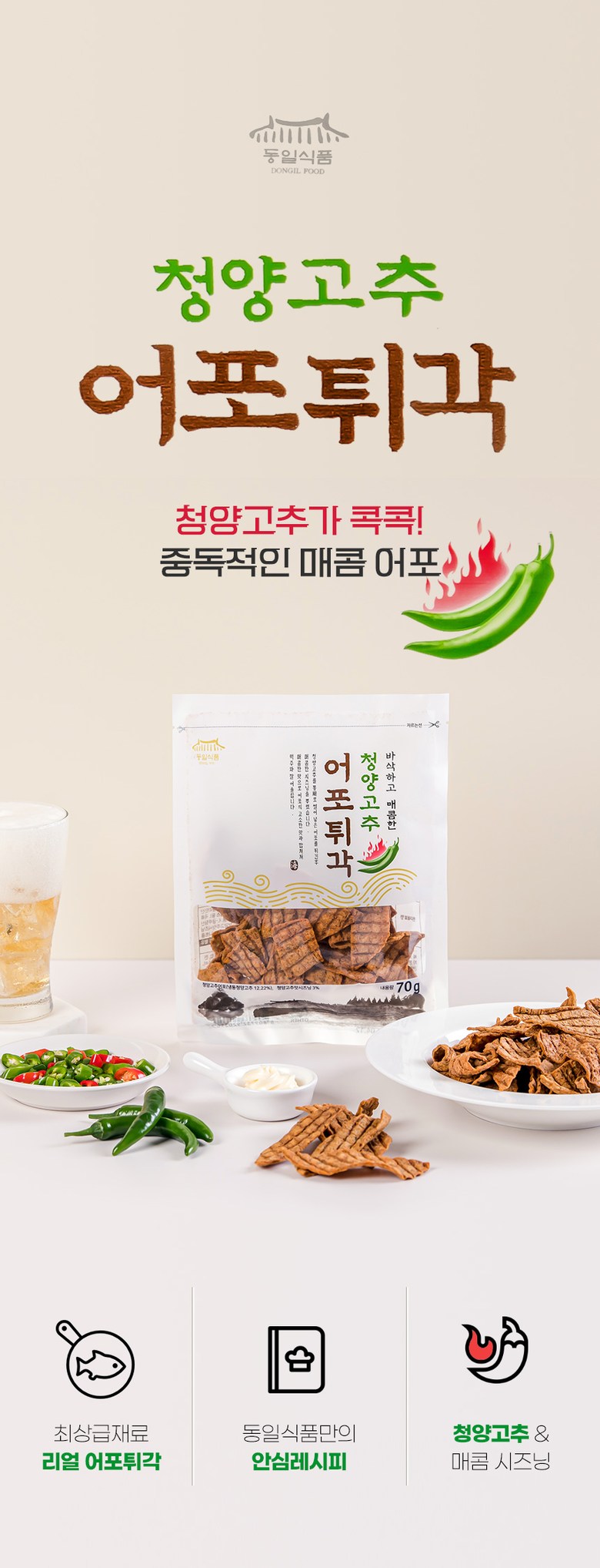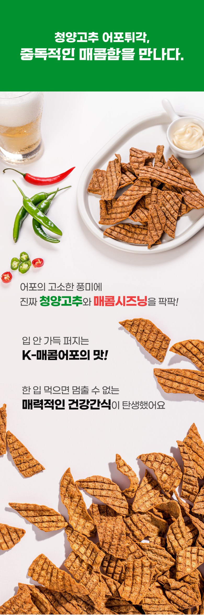 | 포장단위별 내용물의 용량(중량), 수량 | 1봉지 70g 제품상세참조 | 원재료명 및 함량 | 청양고추어포{연육[베트남산/어육(실꼬리돔,백조기,매퉁이,갈치,정어리),설탕,D-소비톨,폴리인산나트륨},냉동청양고추12.22%,백설탕,기타전분(밀/이탈리아,호주,헝가리,프랑스 등),곡류가공품(옥수수100%:외국산/호주,인도네시아,러시아),재제소금(국산),탄산수소타트륨,L-글루탐산나트륨(향미증진제)],콩기름{콩기름(외국산/미국,브라질,파라과이등),규소수지},청양고추맛시즈닝3%{고춧가루(베트남산),복합조미식품(치킨부용베이스),덱스트린,양파분말,백설탕,L-글루탐산나트륨(향미증진제),옥수수가루} 알레르기 유발성분 밀,대두,우유,닭고기 함유 |