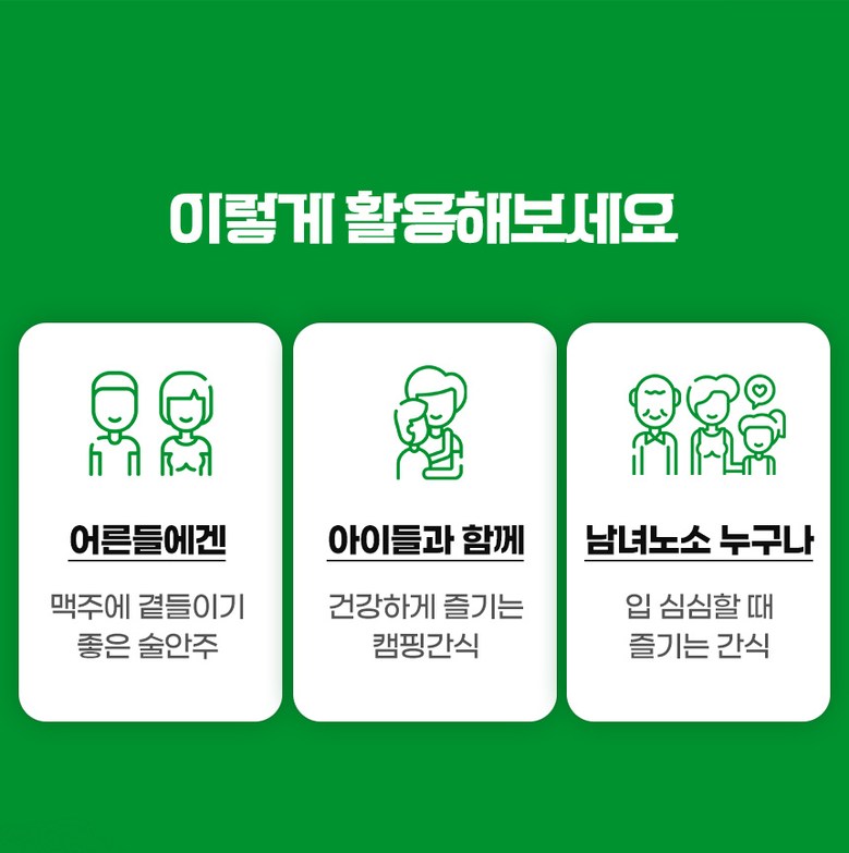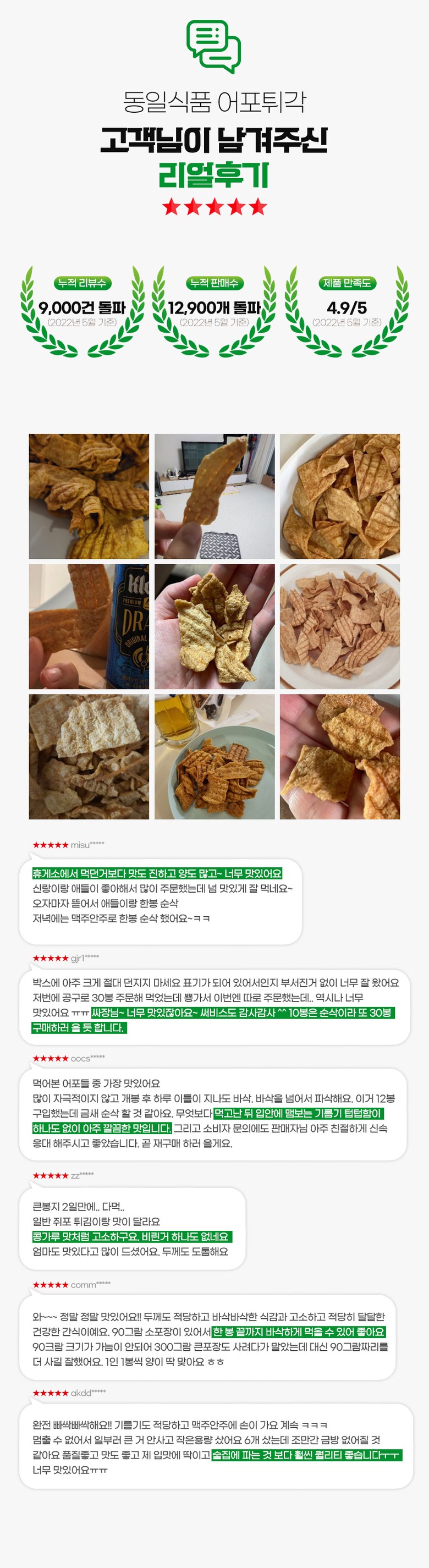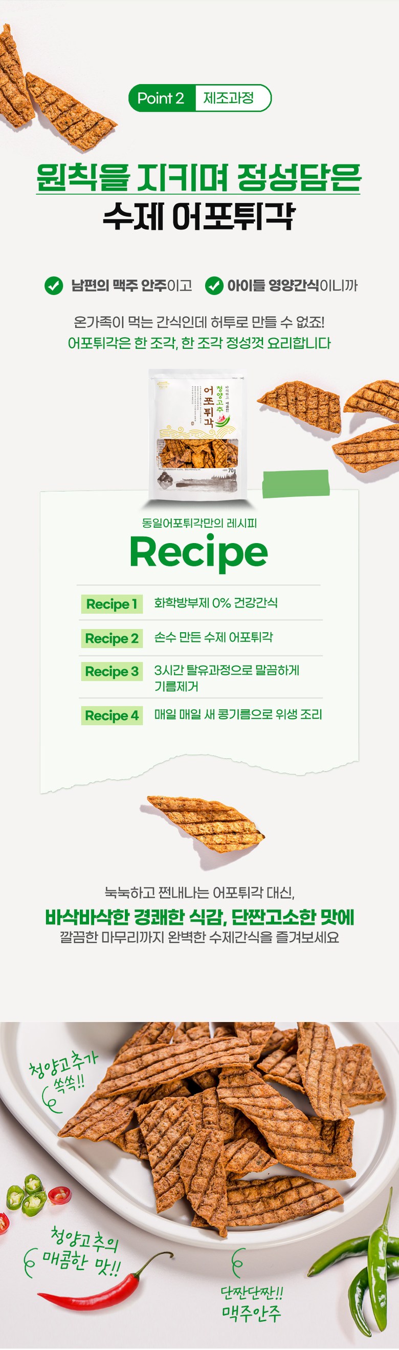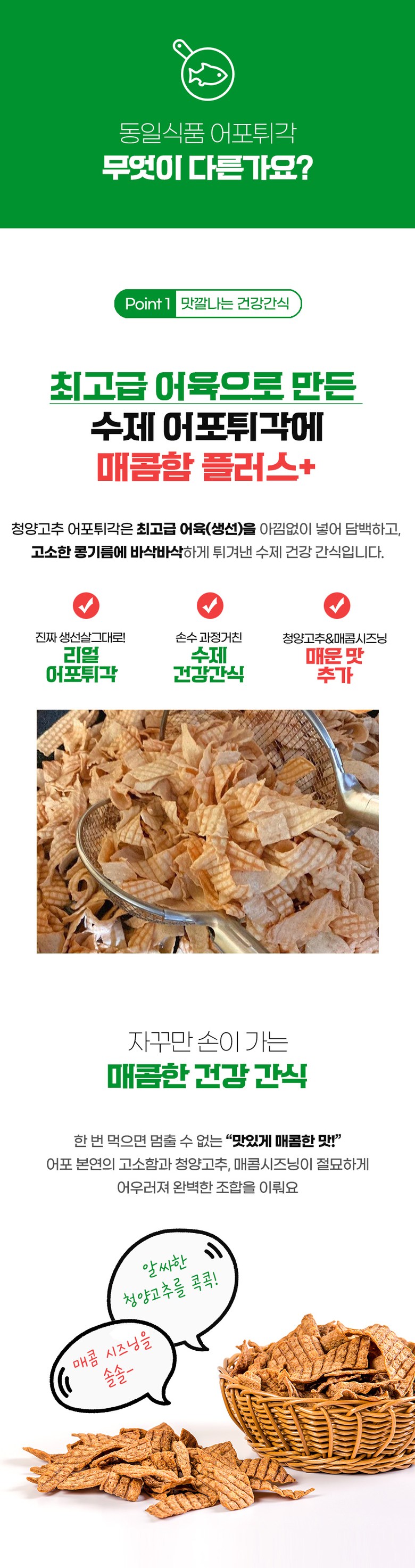 | 포장단위별 내용물의 용량(중량), 수량 | 1봉지 70g 제품상세참조 | 원재료명 및 함량 | 청양고추어포{연육[베트남산/어육(실꼬리돔,백조기,매퉁이,갈치,정어리),설탕,D-소비톨,폴리인산나트륨},냉동청양고추12.22%,백설탕,기타전분(밀/이탈리아,호주,헝가리,프랑스 등),곡류가공품(옥수수100%:외국산/호주,인도네시아,러시아),재제소금(국산),탄산수소타트륨,L-글루탐산나트륨(향미증진제)],콩기름{콩기름(외국산/미국,브라질,파라과이등),규소수지},청양고추맛시즈닝3%{고춧가루(베트남산),복합조미식품(치킨부용베이스),덱스트린,양파분말,백설탕,L-글루탐산나트륨(향미증진제),옥수수가루} 알레르기 유발성분 밀,대두,우유,닭고기 함유 |