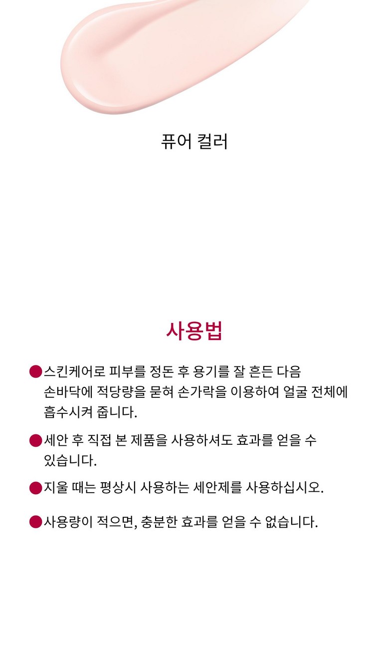 스킨 케어로 피부를 정돈한 후에 사용하십시오. 손바닥에 적당량을 덜어 손가락을 사용하여 얼굴 전체에 흡수시켜 줍니다. 세안 후 직접 본 제품을 사용하셔도 효과를 얻을 수 있습니다. 지울 때는, 평소 사용하는 세안제로 지울 수 있습니다. 사용량이 적으면, 충분한 차단 효과를 얻을 수 없습니다.