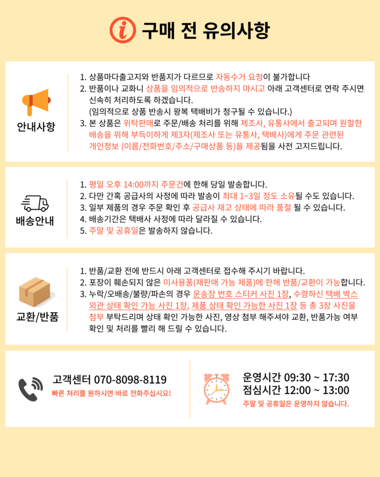 - ㆍ교환/반품에 관한 일반적인 사항은 판매자가 제시사항보다 관계법령이 우선합니다.