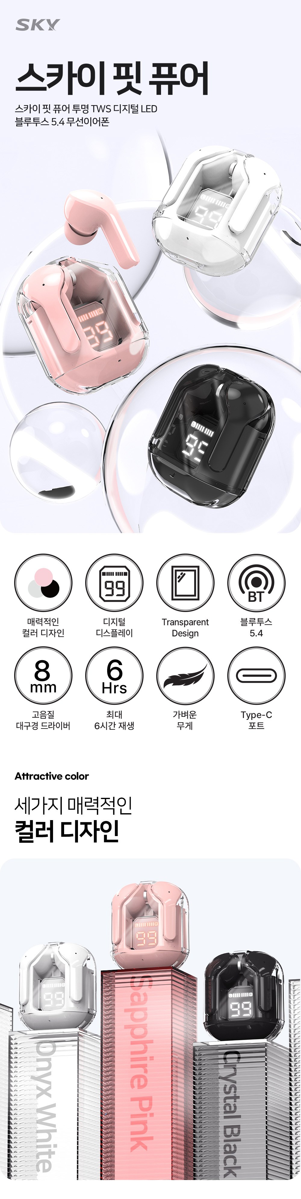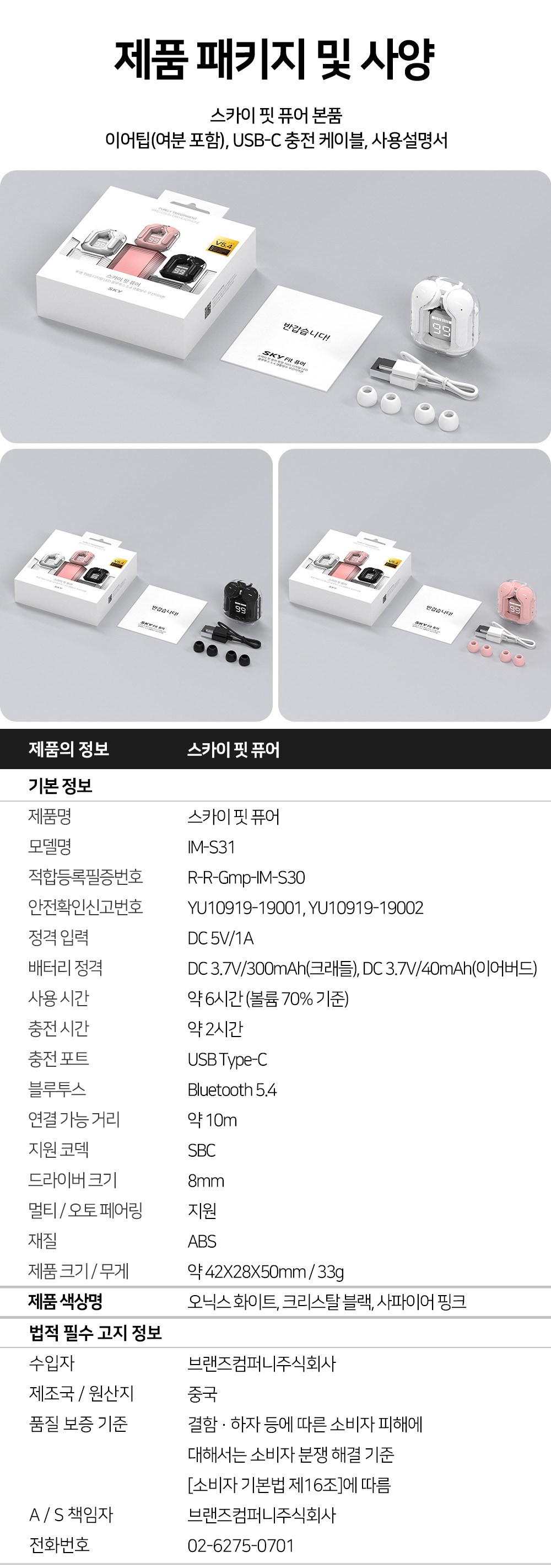 | 품명 및 모델명 | 스카이 핏 퓨어 투명 TWS 디지털 LED 블루투스 5.4 무선이어폰 / IM-S31 | KC 인증정보 | 본품 : R-R-Gmp-IM-S30, 내장배터리(크래들) : YU10919-19002, 내장배터리(이어버드) : YU10919-19001 |