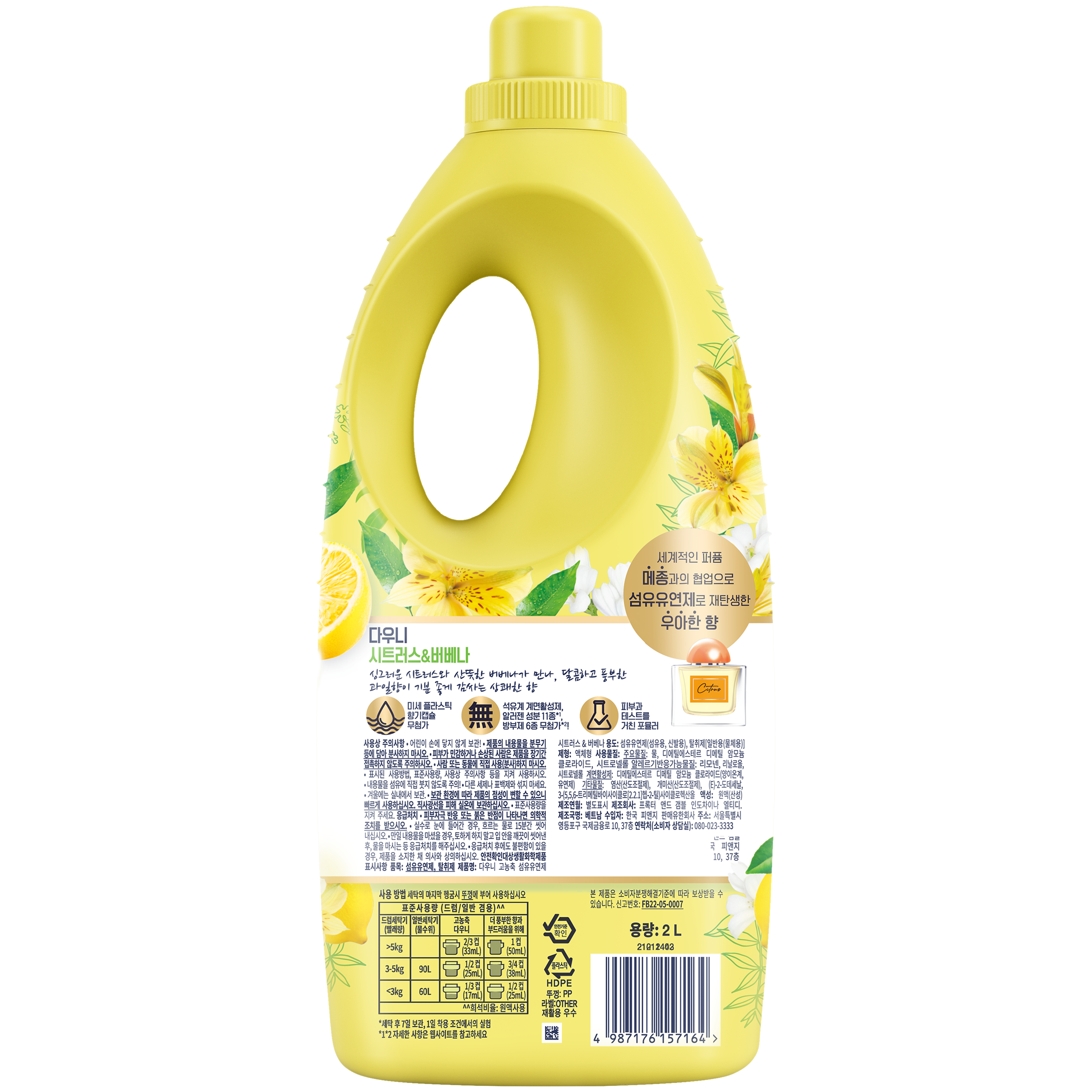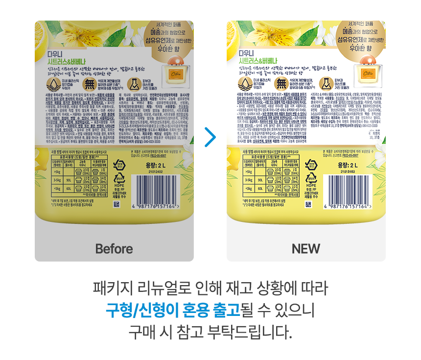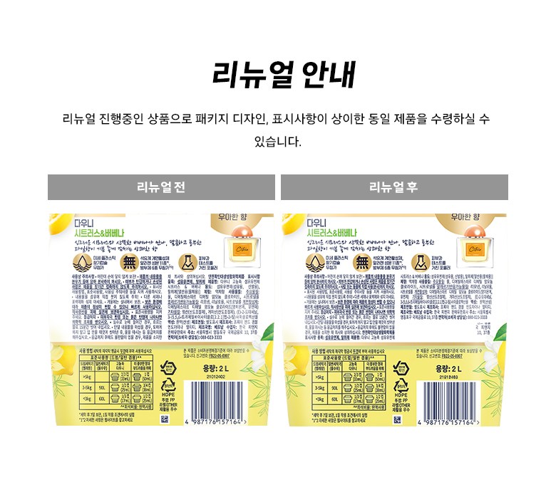 | 품목 및 제품명 | 섬유유연제, 탈취제 / 다우니 고농축 섬유유연제 시트러스 & 버베나 | 용도(표백제의 경우 계열을 함께표시) 및 제형 | 섬유유연제(섬유용, 신발용), 탈취제[일반용(물체용)] / 액체형 |