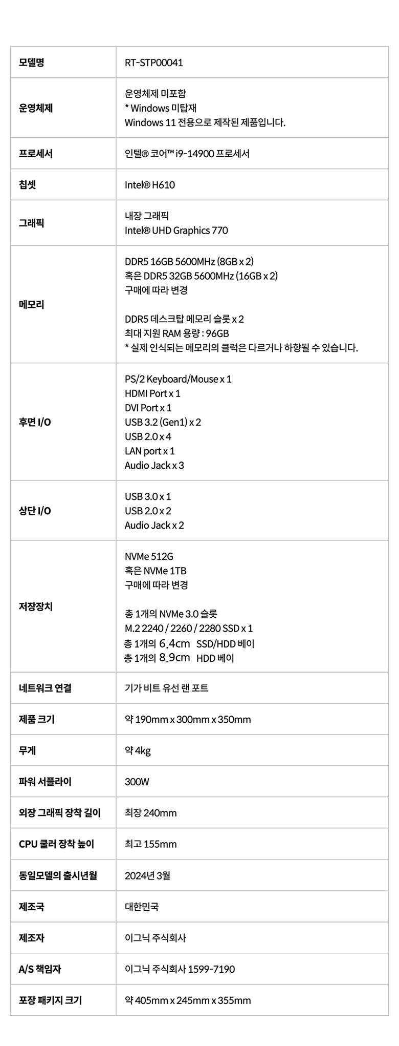 | 품명 및 모델명 | 데스크탑 컴퓨터 / RT-STP00041 | KC 인증정보 | 본품: [전자파 적합성평가(인증)를 받은 내장구성품을 사용하여 조립한 것으로 완성품에 대한 전자파 적합성평가는 받지 않음] / 파워케이블: SU04234-19004 / 전원공급장치: XU101685-18002H, R-R-vSt-VA-700 |