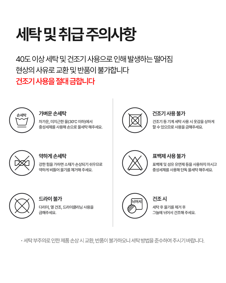 - ㆍ모니터 해상도의 차이로 인해 색상이나 이미지가 실제와 달라, 고객이 단순 변심으로 교환/반품을 무료로 요청하는 경우