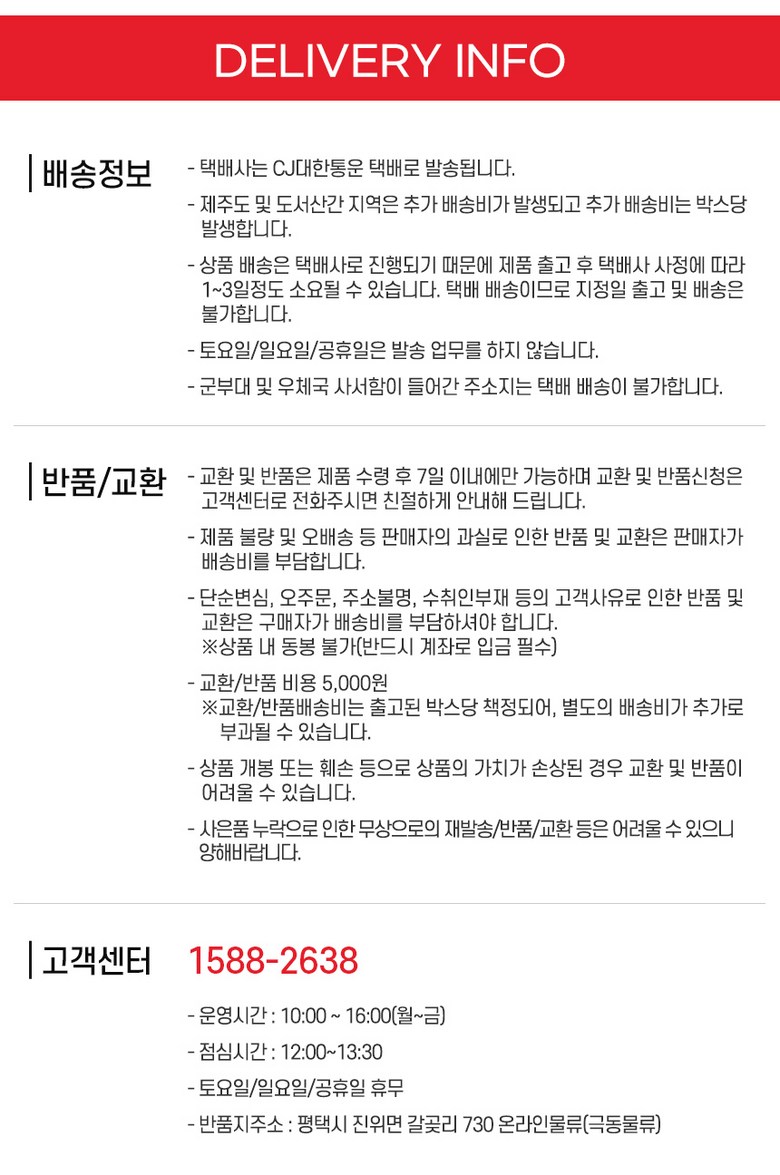 | 교환/반품 비용 (왕복비용) | 5,000원 - 단, 고객 변심의 경우에만 발생 - 도서산간 및 일부 지역 추가비용 발생 |