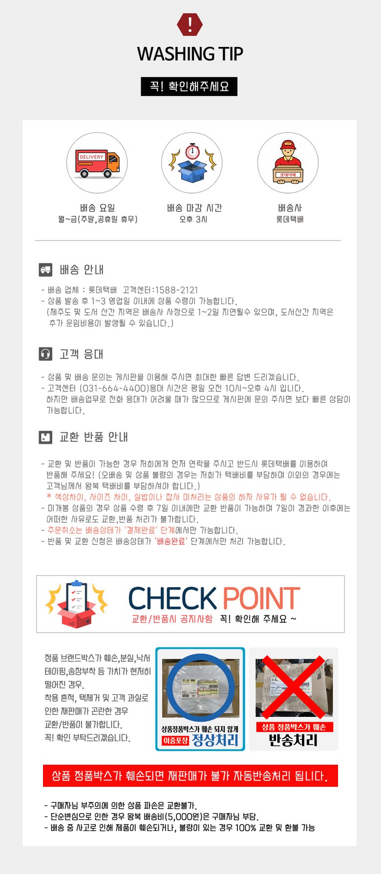 - ㆍ모니터 해상도의 차이로 인해 색상이나 이미지가 실제와 달라, 고객이 단순 변심으로 교환/반품을 무료로 요청하는 경우
