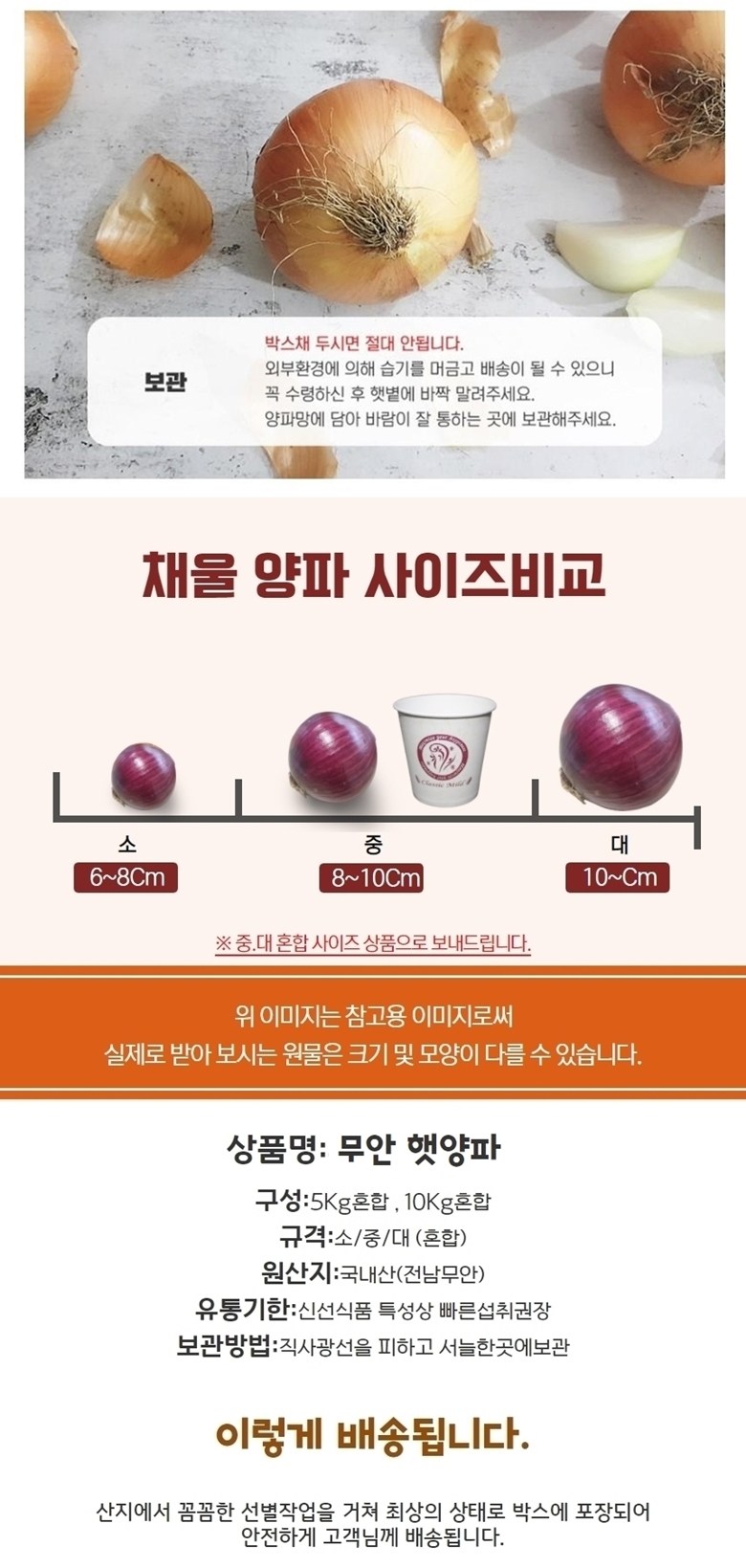 | 품목 또는 명칭 | 무안 양파 빨간양파 5kg/10kg | 포장단위별 내용물의 용량(중량),수량,크기 | 5kg/ 10kg |