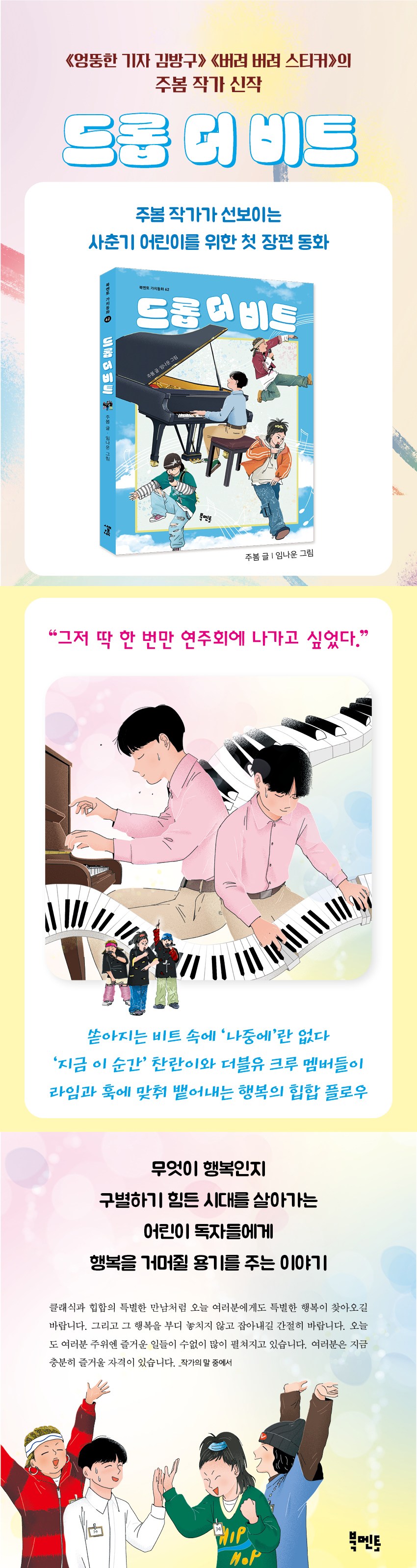 이 책은 ‘과연 행복이란 뭘까?’에 대한 책입니다. ‘참고 기다리면 행복해질 수 있을까?’라는 물음을 던지는 책이지요. 우리는 참고, 기다리고, 경쟁에서 이기면 행복해질 것이라고 굳게 믿고 살아갑니다. 어딘가 잘못되어가고 있다는 것 또한 느끼지만 일단 다른 방법은 생각해 볼 일이 없습니다. 그렇기 때문에 찬란이가 힙합 동아리 친구들과 만나 가슴 뛰는 곳을 향해 달려가는 여정은 어떤 사람들에게는 정답이 아닌 것처럼 보일 수도 있고, 어떤 사람들에게는 덮어놓고 낭만적이라고 느껴질 수도 있습니다. 그러나 주봄 작가는 이 작품을 통해 행복에는 정답이 없다는 점을 분명하게 말하고 있습니다. 당신에게 행복한 것이 나에게는 행복이 아닐 수도 있고, 나에게 행복한 것이 당신에게 행복이 아닐 수도 있다는 것을 정확히 알 때 우리는 진정 행복해질 순간에 올바른 선택을 할 수 있다고 말하고 있습니다. 그리고 그 행복은 누군가에게 평가받을 대상이 아니라는 점을 분명히 하고 있습니다. 이 책을 통해 좀 더 많은 어린이가 행복을 눈앞에 두고 두려워하거나 망설이지 않기를 기원해 봅니다.