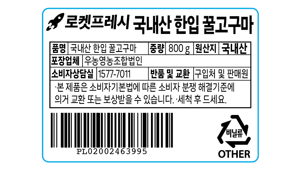 | 품목 또는 명칭 | 국내산 한입 꿀고구마 | 포장단위별 내용물의 용량(중량),수량,크기 | 800g x 1개 |