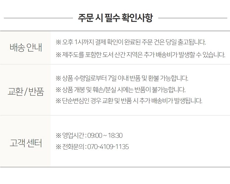 - ㆍ모니터 해상도의 차이로 인해 색상이나 이미지가 실제와 달라, 고객이 단순 변심으로 교환/반품을 무료로 요청하는 경우