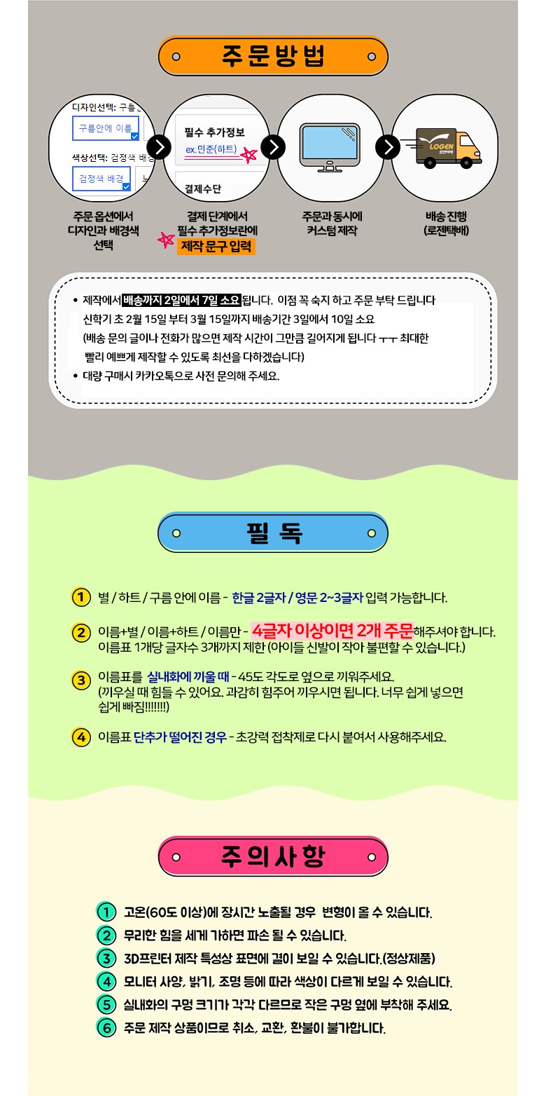 | 배송방법 | 주문제작 | 배송비 | 3,000원 - 30,000원 이상 구매 시 무료배송 · 도서산간 추가 배송비 - 제주 지역: 4,000원 - 도서산간 지역: 3,000원 |