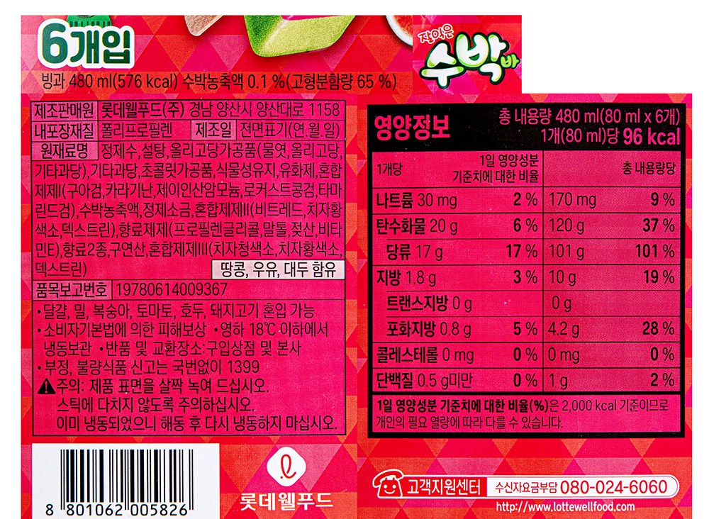 | 제품명 | 잘익은수박바 | 식품의 유형 | 컨텐츠 참조 |