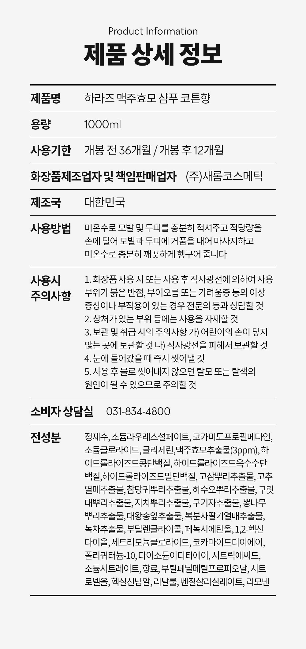 | 용량(중량) | 1000ml | 제품 주요 사양 | 모든 모발용 |