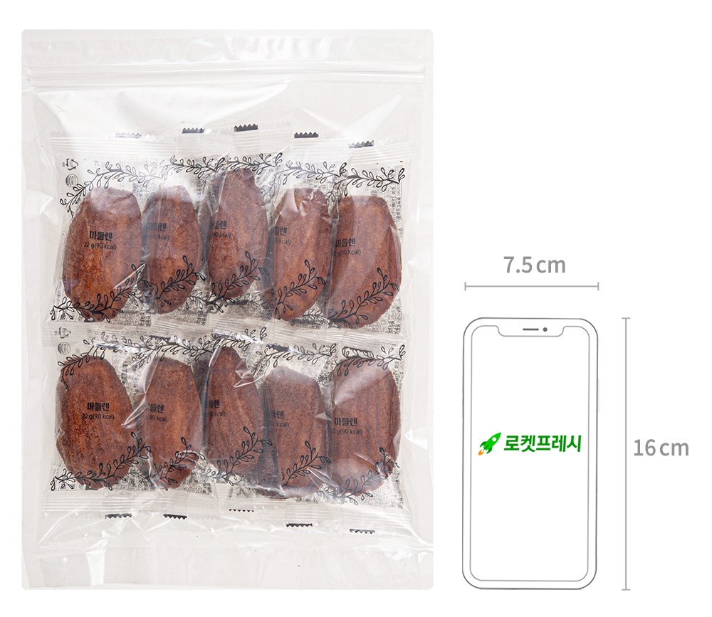 마들렌은 조개 모양의 빵으로, 촉촉한 식감을 자랑하는 디저트예요. 한입 베어 물면, 폭신한 빵이 혀끝에서 사르르 녹아들며 달달한 여운을 남기지요. 담백한 차, 쌉싸름한 커피를 곁들여 근사한 디저트 타임을 가져보세요. 하나씩 낱개 포장되어 간편하게 드실 수 있답니다.