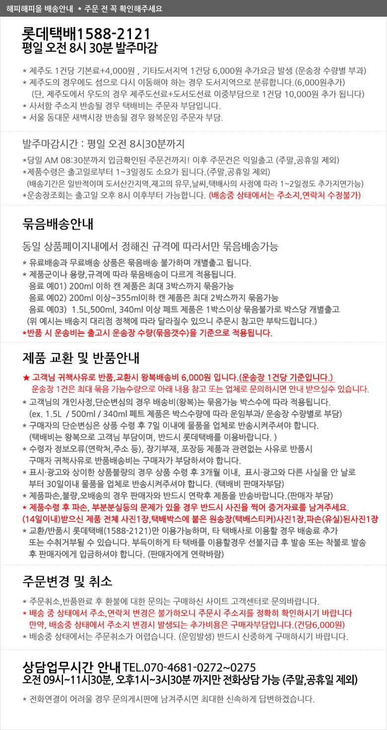 | 배송방법 | 순차배송 | 배송비 | 무료배송 · 도서산간 추가 배송비 - 제주 지역: 4,000원 - 도서산간 지역: 6,000원 |