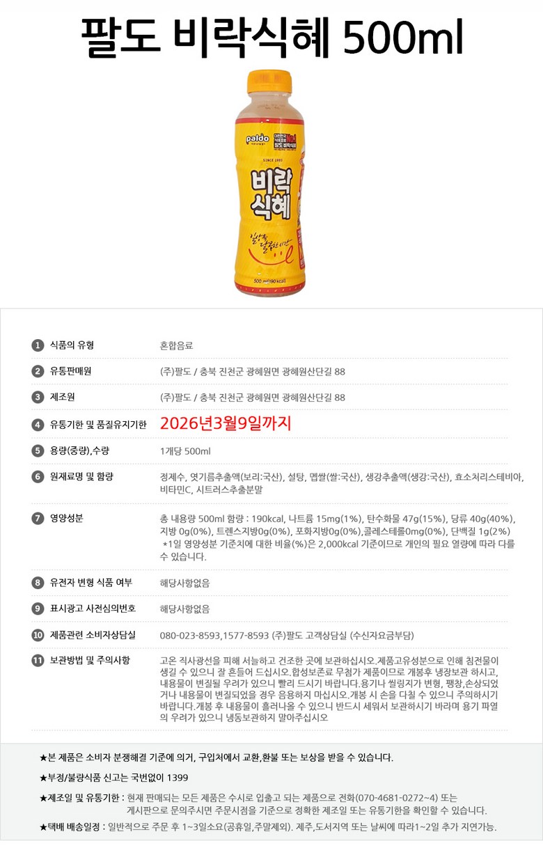 | 생산자 및 소재지 | 상품상세설명참조 | 제조연월일, 소비기한 또는 품질유지기한 | 2026.3.9 |
