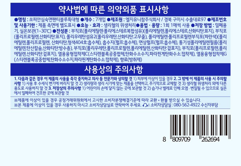 | 품명 및 모델명 | 쏘피안심숙면팬티블루특대형 | 인증/허가 사항 | 의약외품 |
