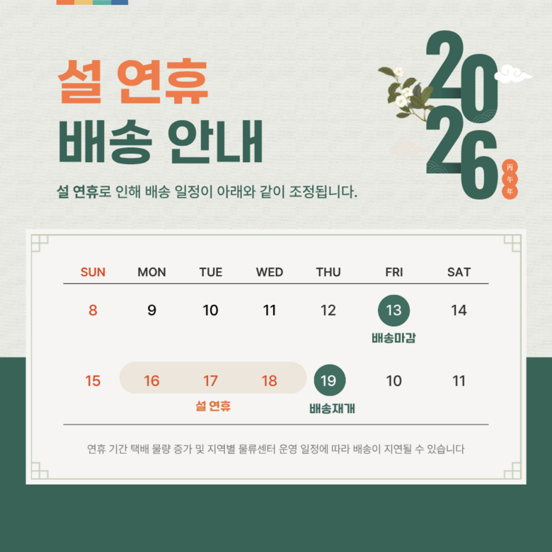 | 배송기간 | ㆍ도서산간 지역 등은 배송에 3-5일이 더 소요될 수 있습니다. - 천재지변, 물량 수급 변동 등 예외적인 사유 발생 시, 다소 지연될 수 있는 점 양해 부탁드립니다. | ||