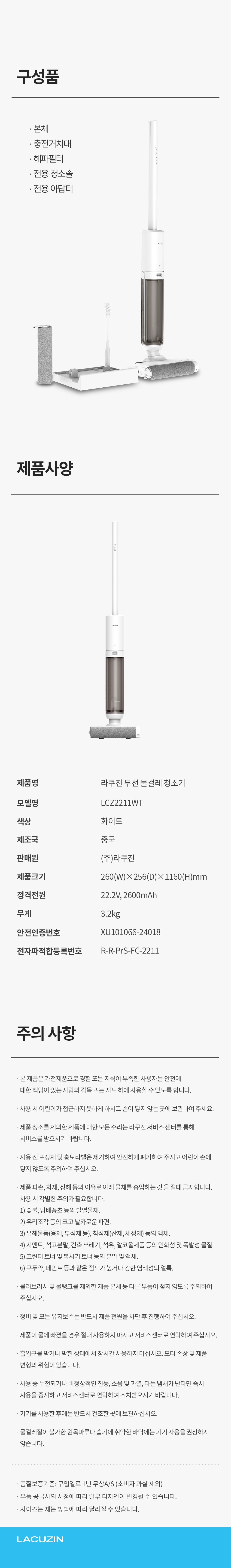 | 품명 및 모델명 | 무선 물걸레 청소기 / LCZ2211WT | KC 인증정보 | 본품 : R-R-PrS-FC-2211 / 전지 :XU101066-24018 / 어댑터 : HU07668-22006A, R-R-ZD4-ZD012M250080EK |