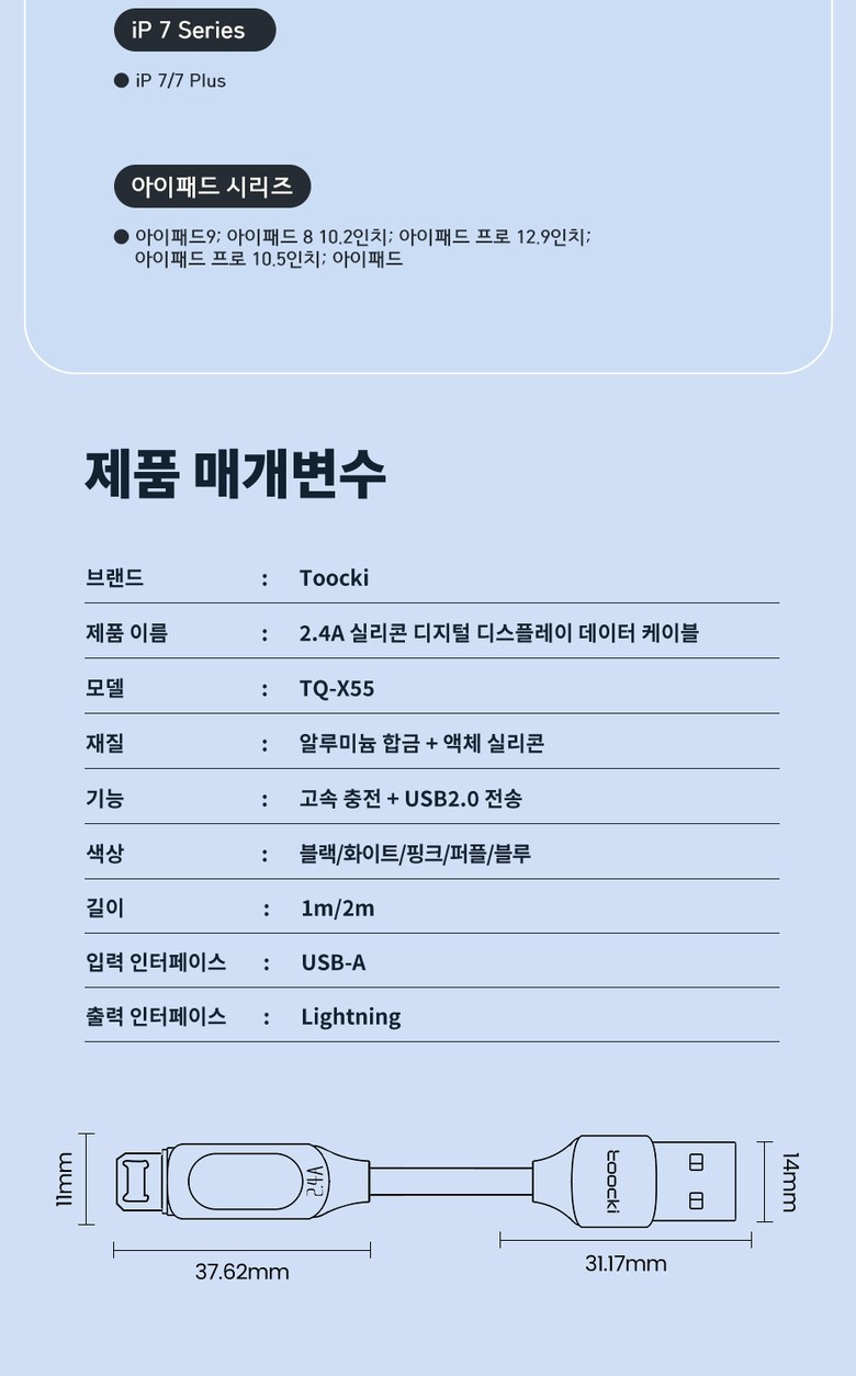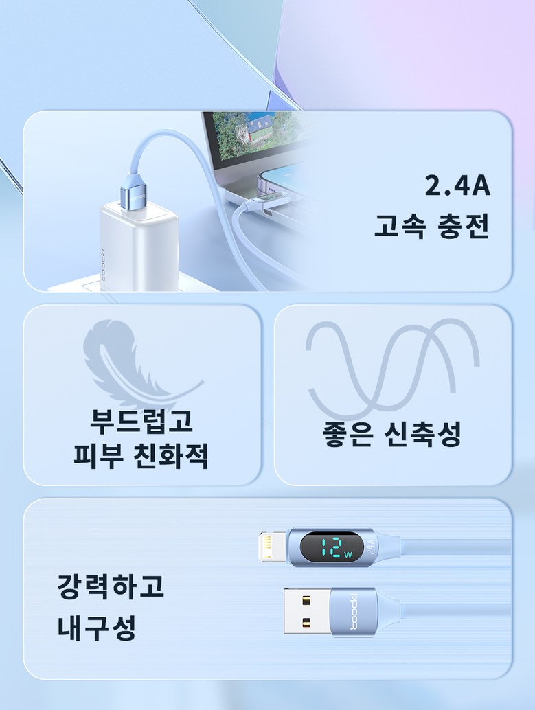 | 품명 및 모델명 | TOOCKI 디스플레이 라이트 Ato8핀/라이트닝 고속 충전케이블 | KC 인증정보 | 상품 상세페이지 참조 |