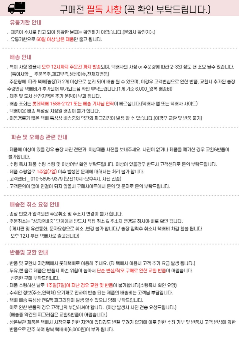 | 배송방법 | 순차배송 | 배송비 | 무료배송 - 도서산간 지역 배송불가 |