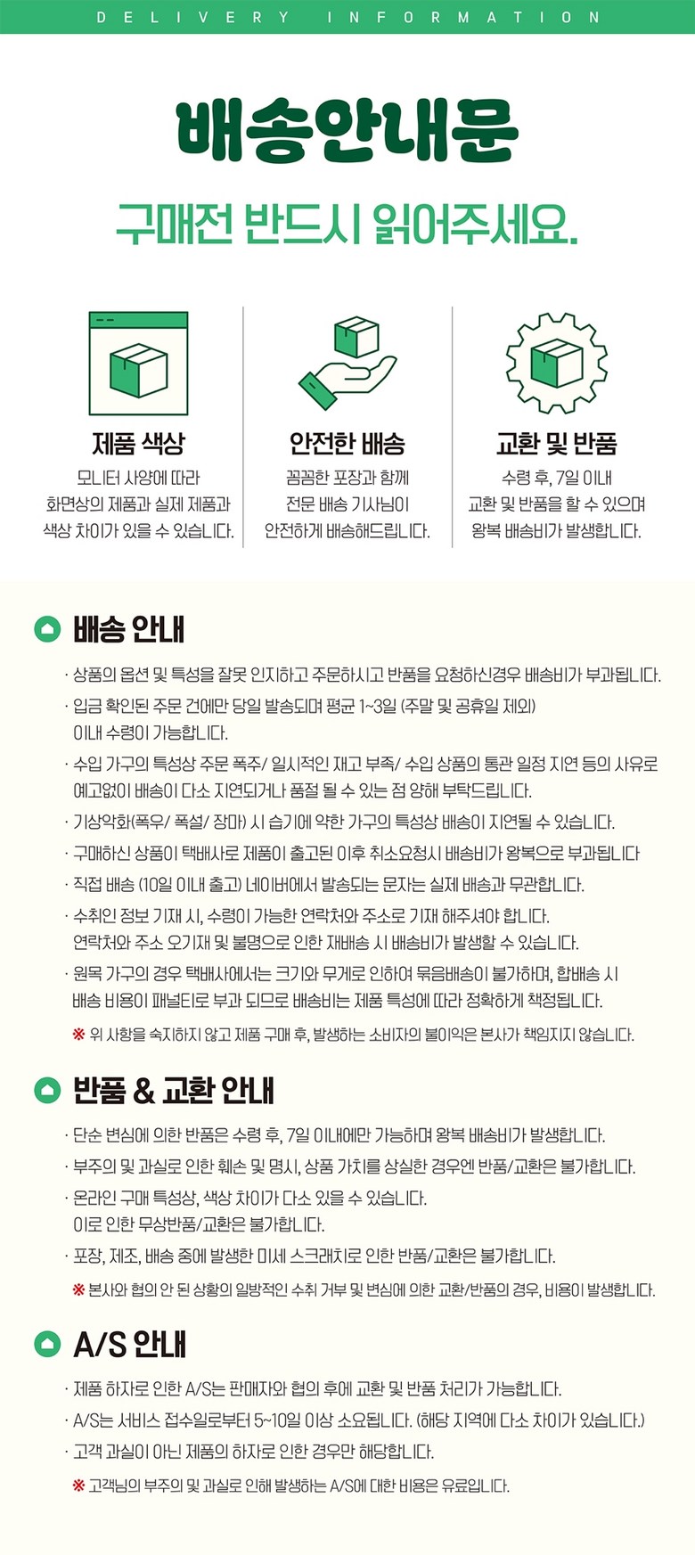 - ㆍ모니터 해상도의 차이로 인해 색상이나 이미지가 실제와 달라, 고객이 단순 변심으로 교환/반품을 무료로 요청하는 경우
