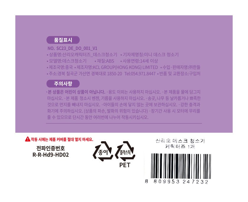 | 품명 및 모델명 | 산리오 데스크 청소기 케릭터즈 1개 / 데스크청소기 | 인증/허가 사항 | R-R-Hd9-HD02 |