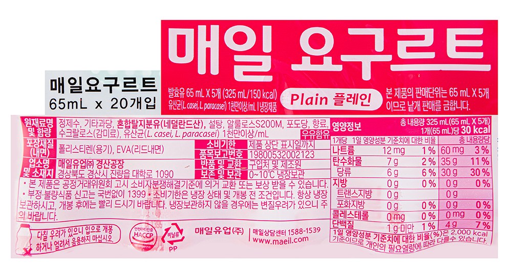 | 제품명 | 매일 요구르트 플레인 | 식품의 유형 | 컨텐츠 참조 |