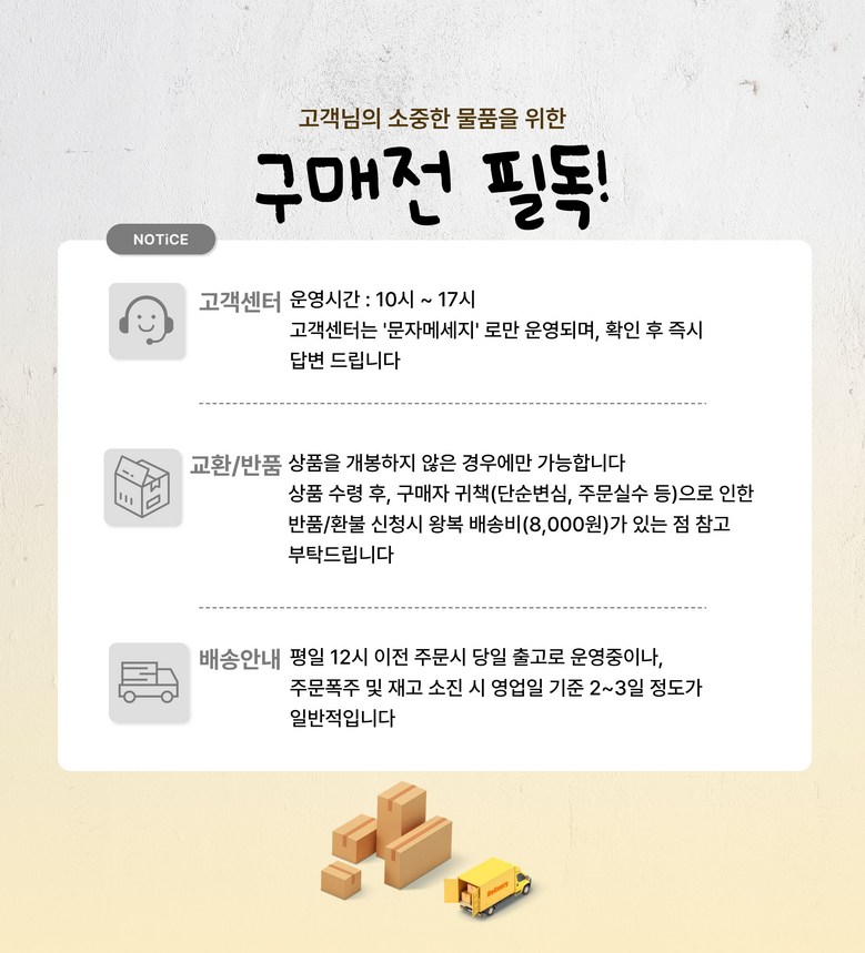 | 교환/반품 비용 (왕복비용) | 8,000원 - 단, 고객 변심의 경우에만 발생 - 도서산간 지역 배송불가 |