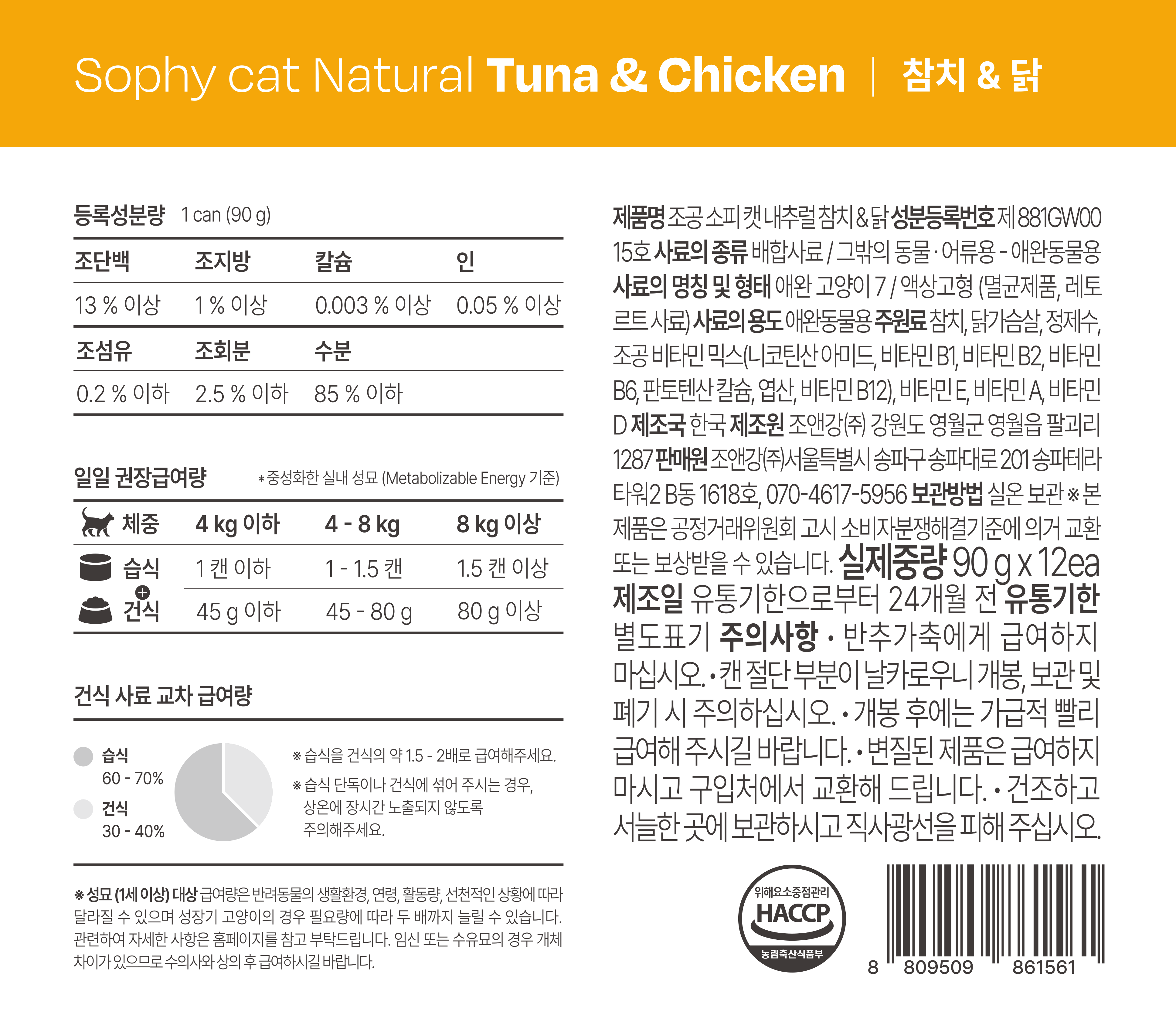 | 품명 및 모델명 | 조공 소피 캣 내추럴 참치&닭 | 인증/허가 사항 | 사료관리법에 따른 성분등록번호 : 컨텐츠 참조 |