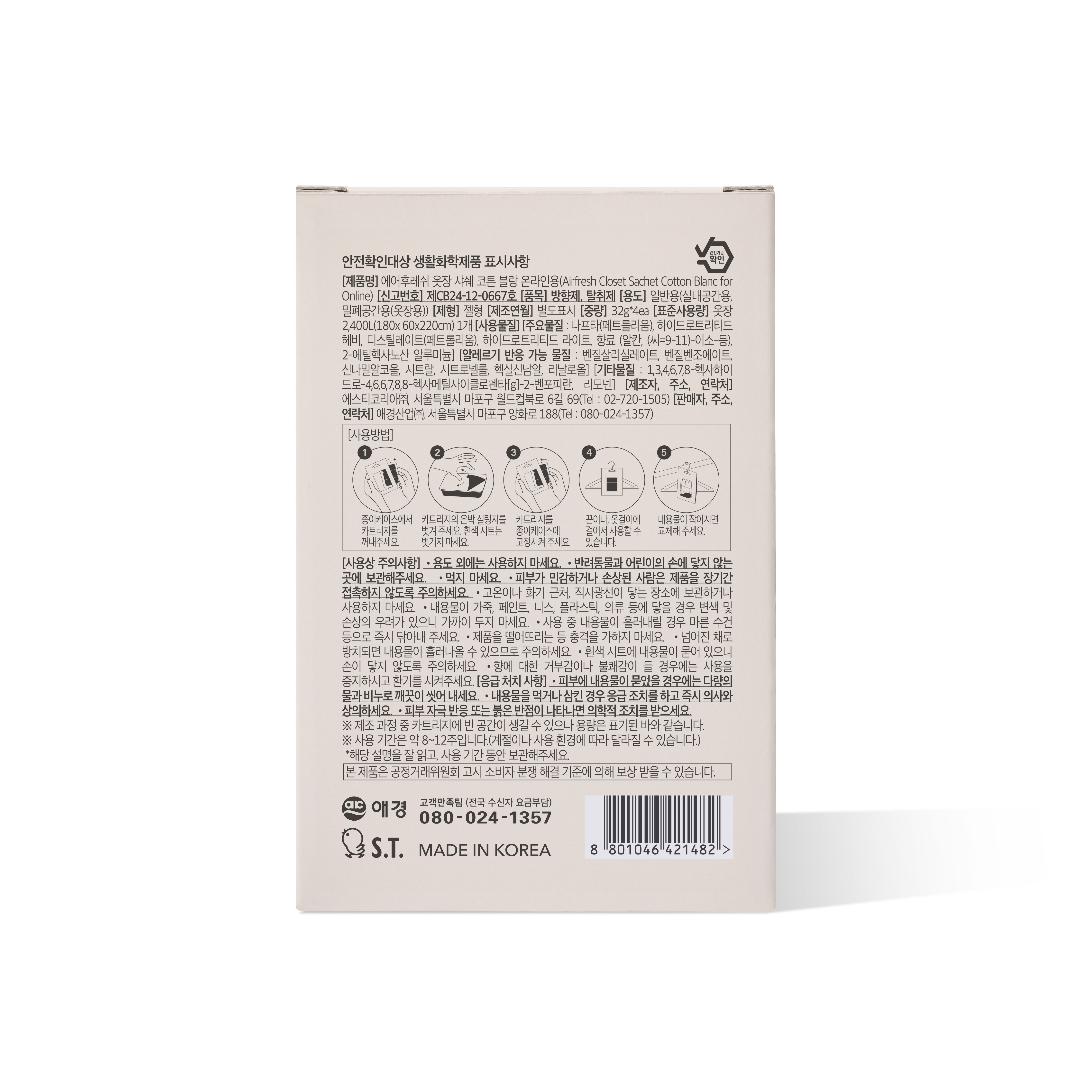 | 품목 및 제품명 | 방향제,탈취제 / 에어후레쉬 옷장 샤쉐 코튼 블랑 온라인용 | 용도(표백제의 경우 계열을 함께표시) 및 제형 | 일반용-실내공간용,일반용-밀폐공간용-옷장용 / 비분사형-에멀션형(젤형) |