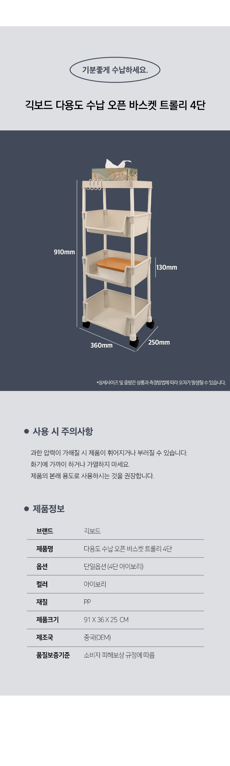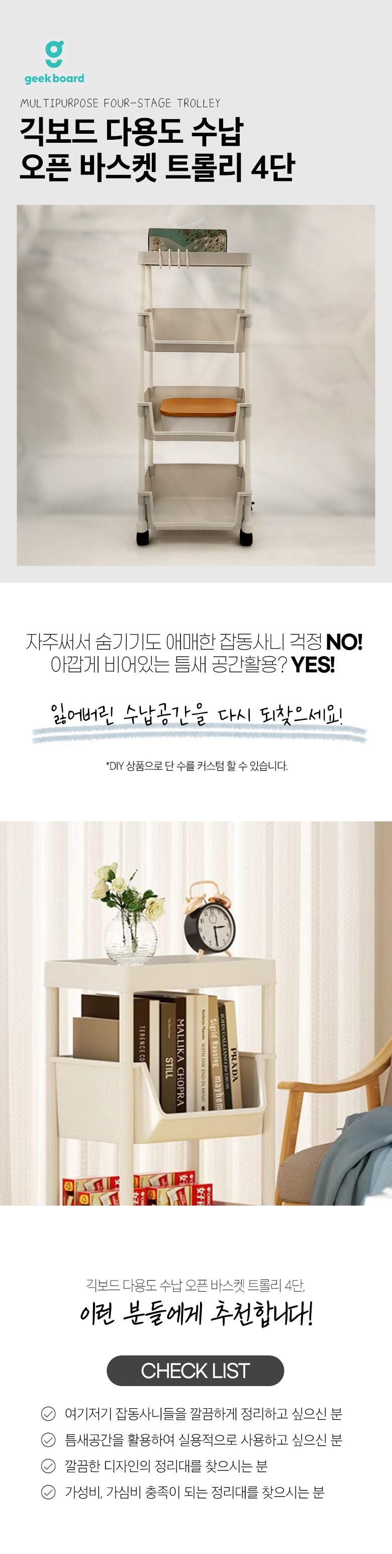 | 품명 | 긱보드 다용도 수납 오픈 바스켓 트롤리 4단 | KC 인증정보 | 해당없음 |