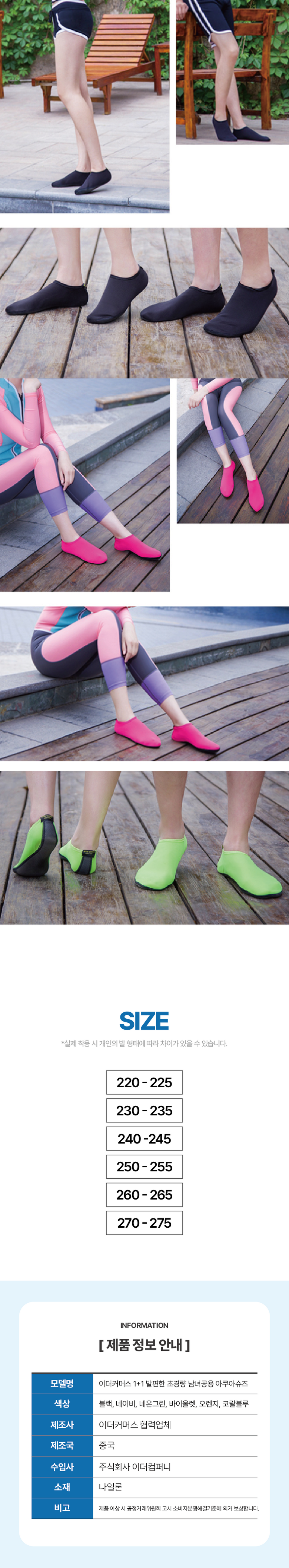 | 품명 및 모델명 | 이더커머스 1+1 발편한 초경량 남녀공용 아쿠아슈즈 | 인증/허가 사항 | 인증사항 해당없음 |