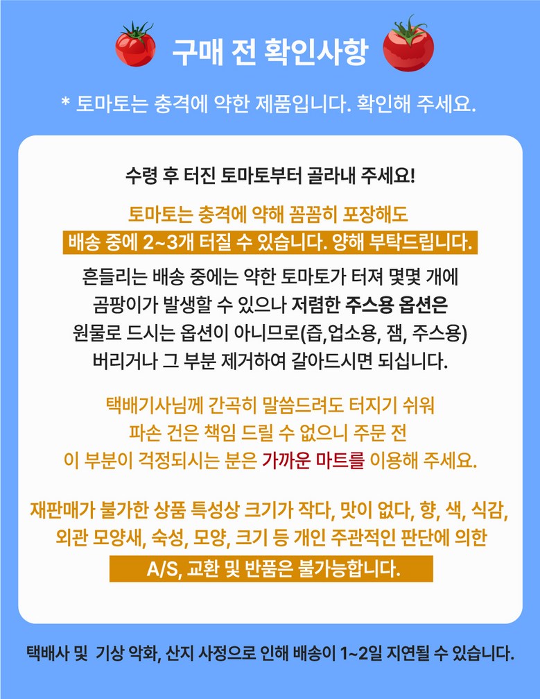 주스용 토마토 특성상 저렴히 판매하는 옵션이다 보니 뽁뽁이 없이 발송됩니다. 3kg 5kg는 무게가 무거워 배송 중 터질 수 있으며, 무름, 터짐으로 인한 교환, 환불이 불가하오니 신중히 구매해 주시고 걱정되시는 분들은 가까운 마트를 이용해 주세요.