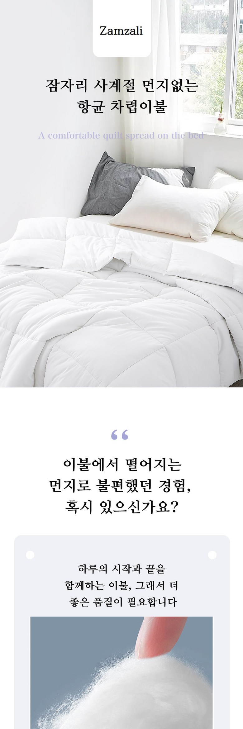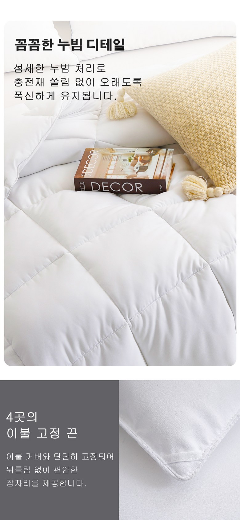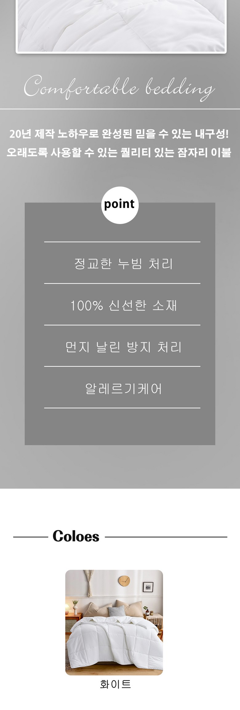 | 제품 소재 | ♥컽면: 폴리에스터 100%(일반 원단보다 훨씬 부드러운 특수 가공으로) ♥총전재:중공 풀리에스테르면100%(인조 깃털보다 가볍고 따뜻함) | 색상 | 화이트/흰색 |
