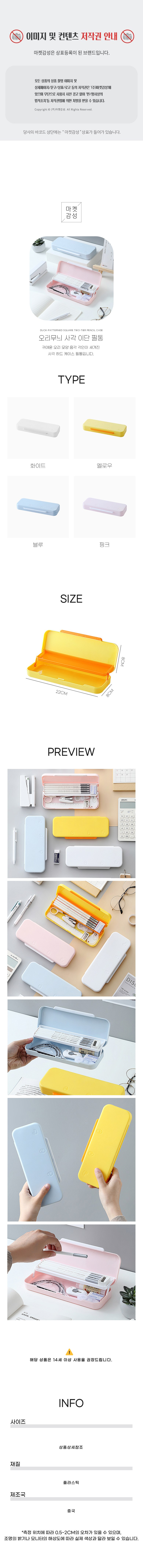 | 품명 및 모델명 | 마켓감성 오리무늬 사각 이단 필통 블루 | 인증/허가 사항 | 해당없음(14세이상) |