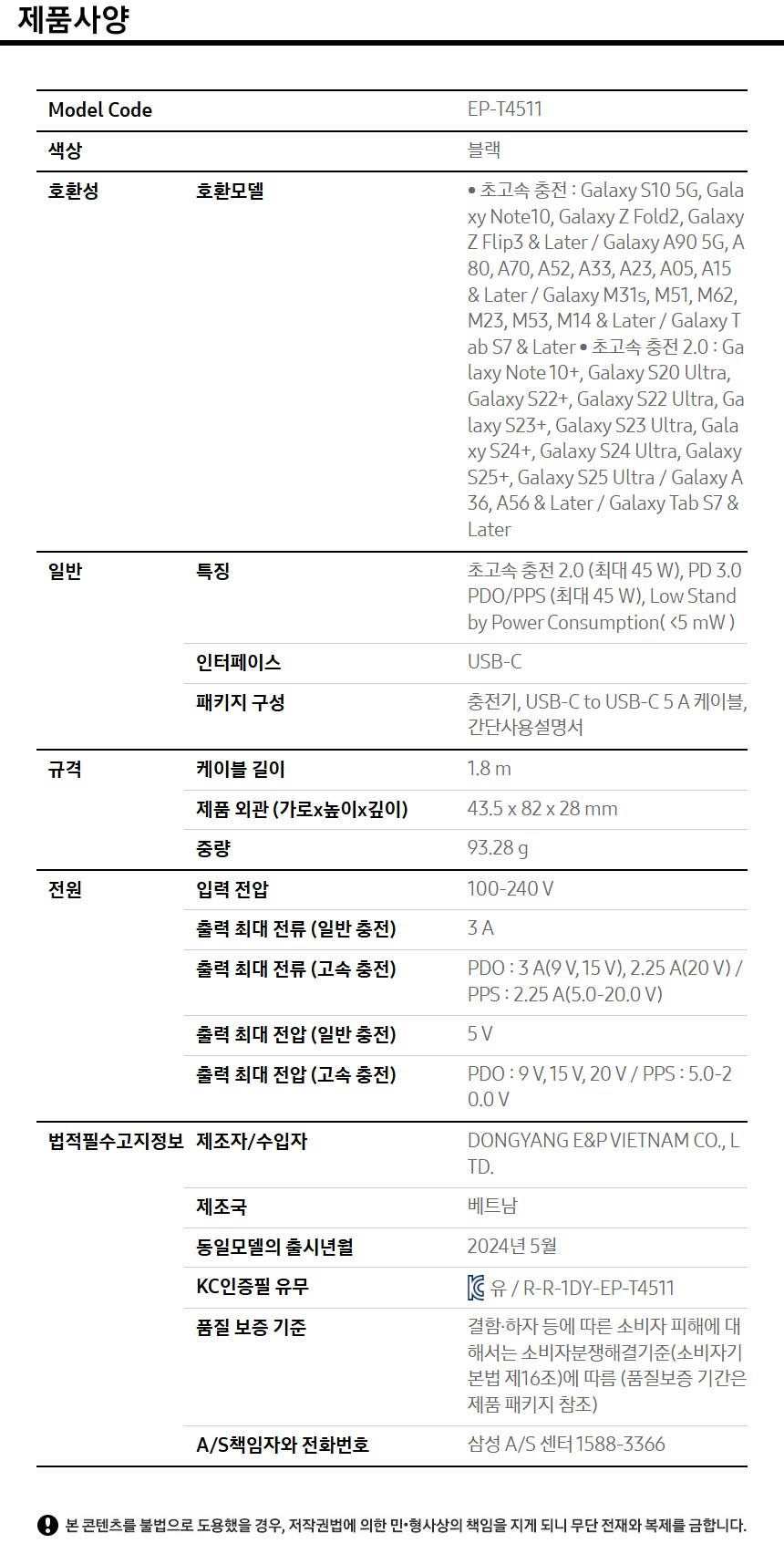 | 제조자(수입자) | 동양이엔피 주식회사, DONGYANG E&P VIETNAM CO., LTD. / DONGYANG E&P VIETNAM CO., LTD | 제조국 | 베트남 |