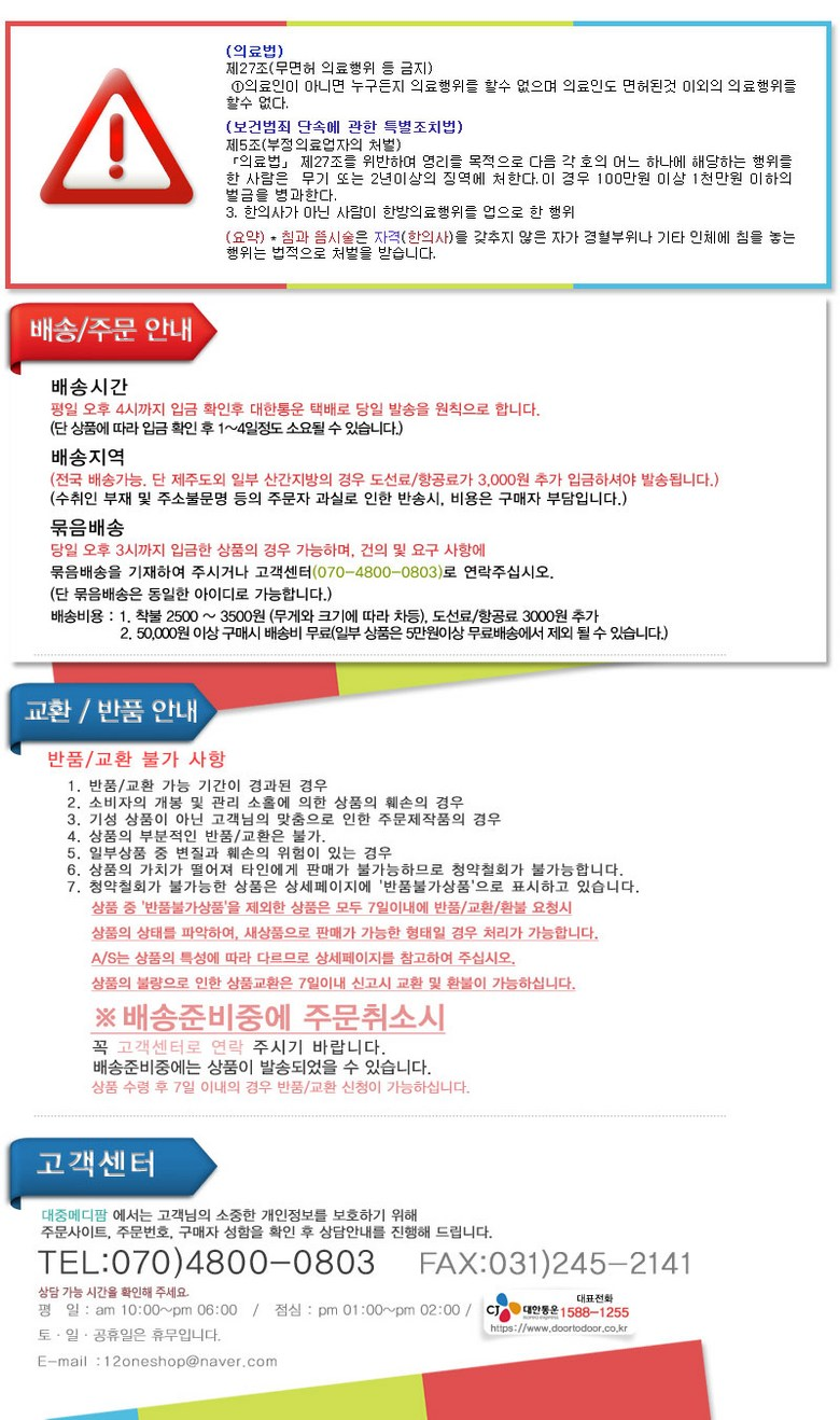 - ㆍ교환/반품에 관한 일반적인 사항은 판매자가 제시사항보다 관계법령이 우선합니다.