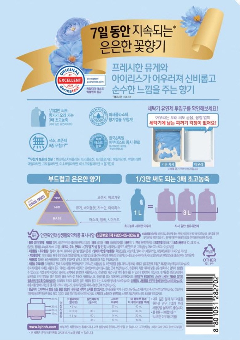 | 품목 및 제품명 | 섬유유연제 / 엘지 샤프란 아우라 홀리데이판타지 알파 | 용도(표백제의 경우 계열을 함께표시) 및 제형 | 섬유용 / 비분사형-액체형 |