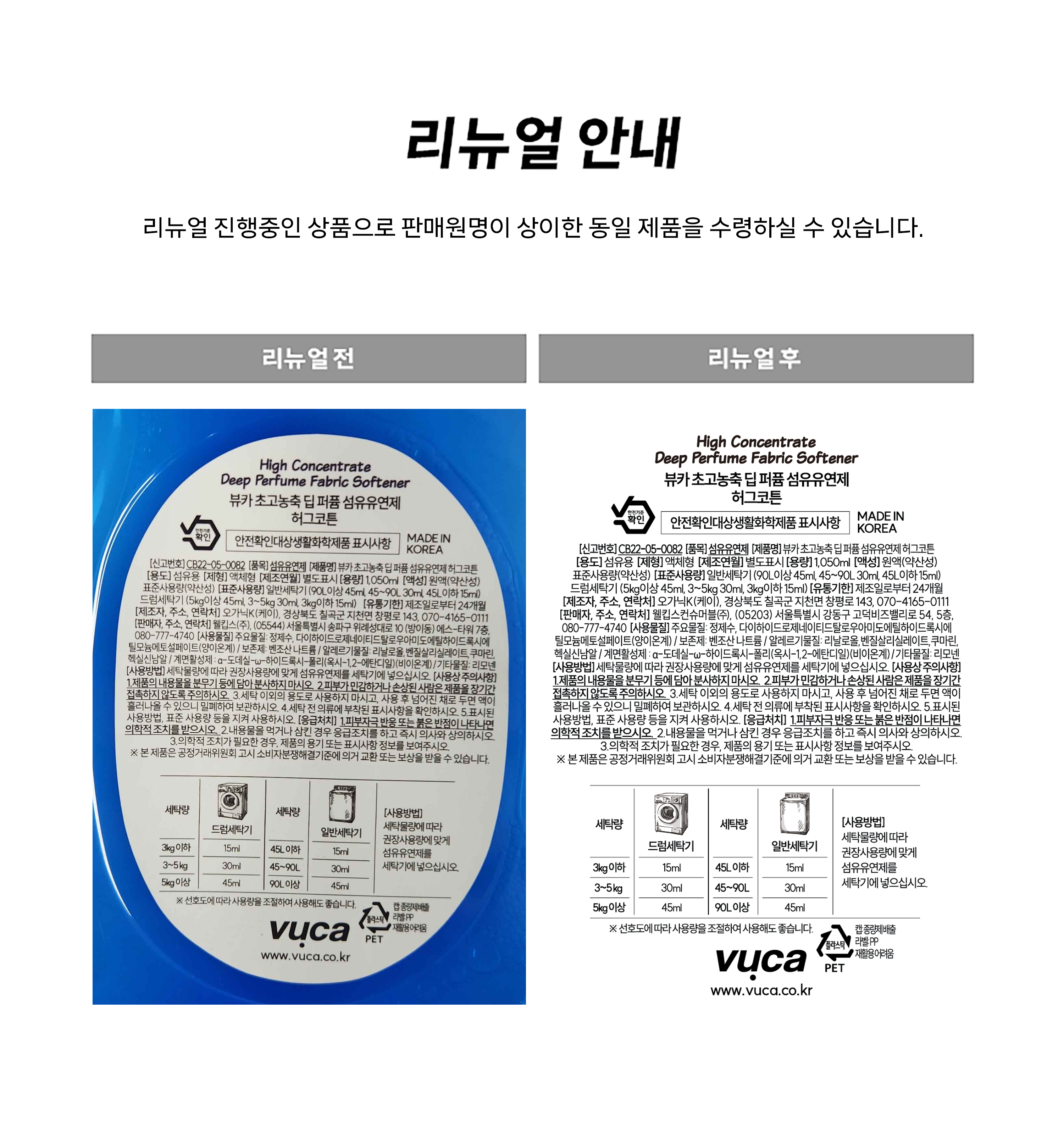 | 품목 및 제품명 | 섬유유연제 / 뷰카 초고농축 딥 퍼퓸 섬유유연제 허그코튼 | 용도(표백제의 경우 계열을 함께표시) 및 제형 | 섬유용 / 액체형 |