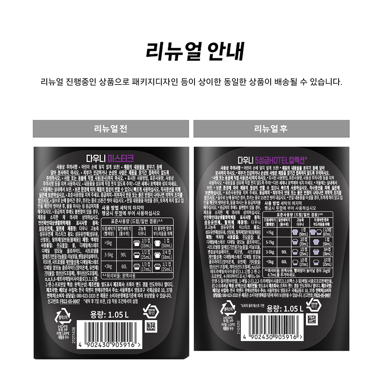 | 품목 및 제품명 | 리뉴얼전: 섬유유연제, 탈취제 / 다우니 고농축 섬유유연제 미스티크 | 리뉴얼후: 섬유유연제, 탈취제 / 다우니 초고농축 섬유유연제 미스티크 | 용도(표백제의 경우 계열을 함께표시) 및 제형 | 섬유유연제(섬유용, 신발용), 탈취제[일반용(물체용)] / 액체형 |