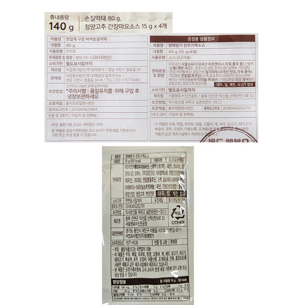 맛있게 구운 바싹 손질먹태예요. 180도 고온에서 구워 바삭바삭한 식감을 즐길 수 있는데요. 명태의 진한 고소함이 입안 가득 느껴지지요. 짭짤하면서도 매콤한 소스가 함께 들어있으니, 간단한 술안주로 제격이랍니다.