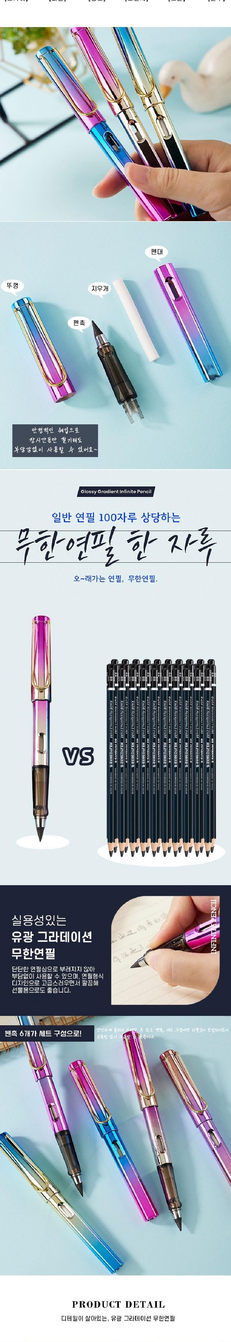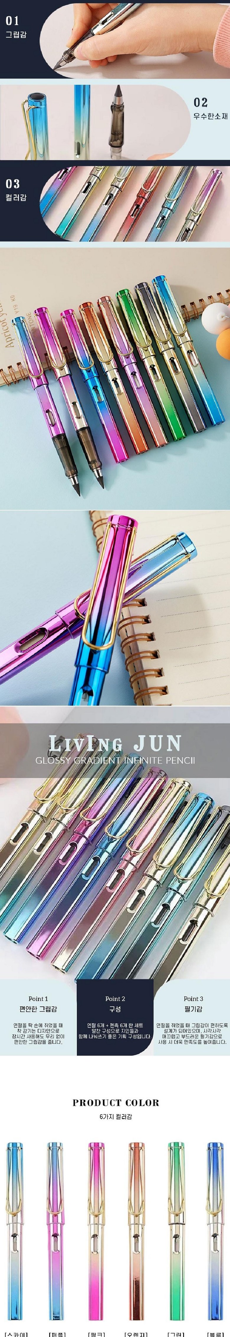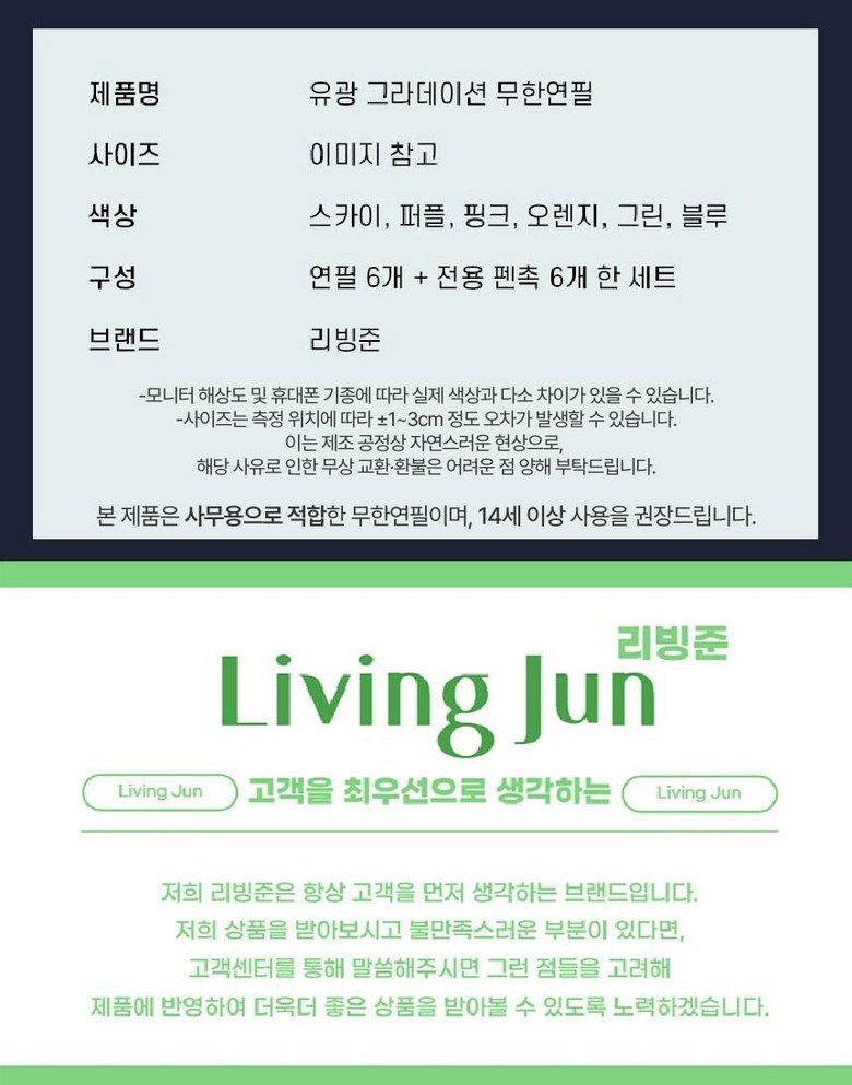 | 품명 및 모델명 | 리빙준 깎지않는 유광 그라데이션 무한연필 6P + 리필심 6P | 인증/허가 사항 | 해당사항없음 |