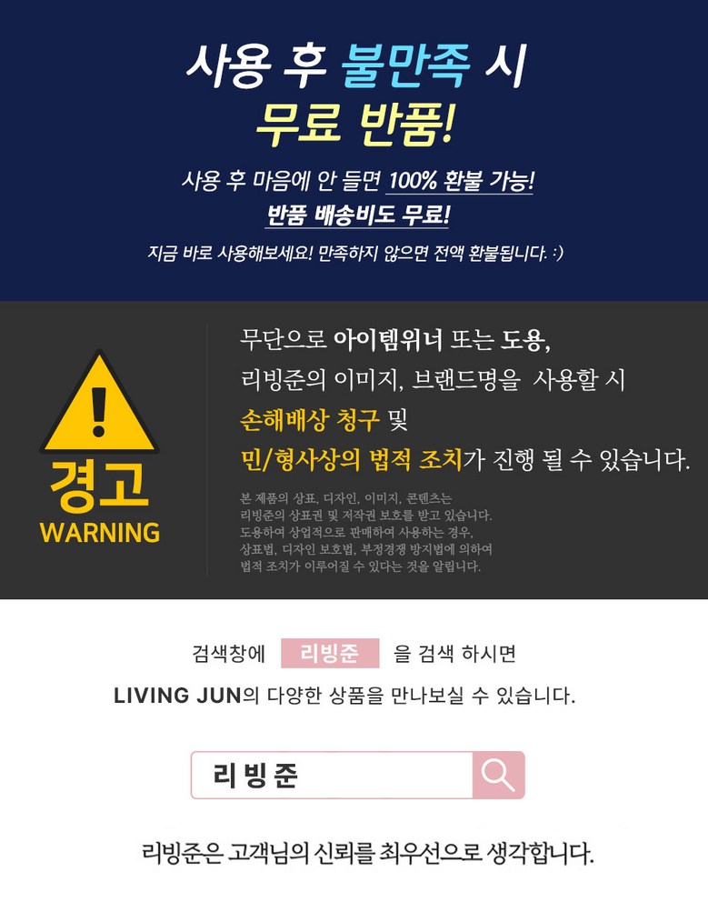 - ㆍ모니터 해상도의 차이로 인해 색상이나 이미지가 실제와 달라, 고객이 단순 변심으로 교환/반품을 무료로 요청하는 경우