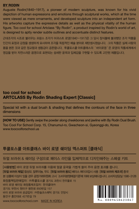 | 화장품제조업자, 화장품책임판매업자 및 맞춤형화장품판매업자 | [쉐딩] 한국콜마(주) / (주)투쿨포스쿨 [브러쉬] (주)한솔코스메틱 / 업체 미제공 | 제조국 | [쉐딩] 대한민국 [브러쉬] 중국 |