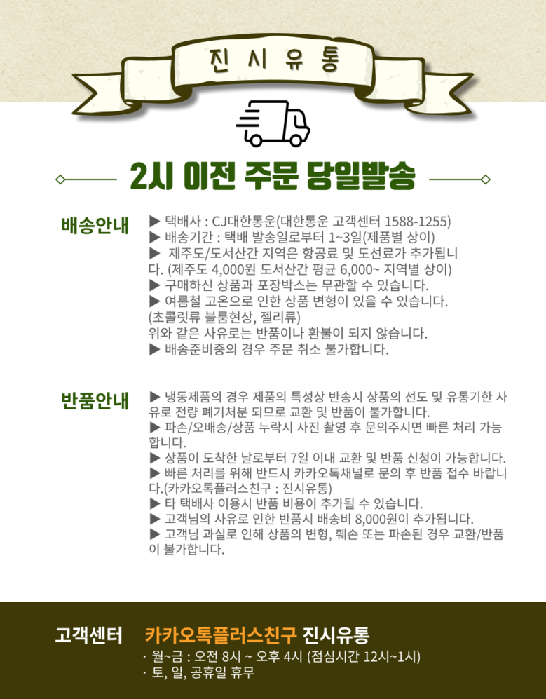 | 배송방법 | 순차배송 | 배송비 | 무료배송 · 도서산간 추가 배송비 - 제주 지역: 4,000원 - 도서산간 지역: 0원 |