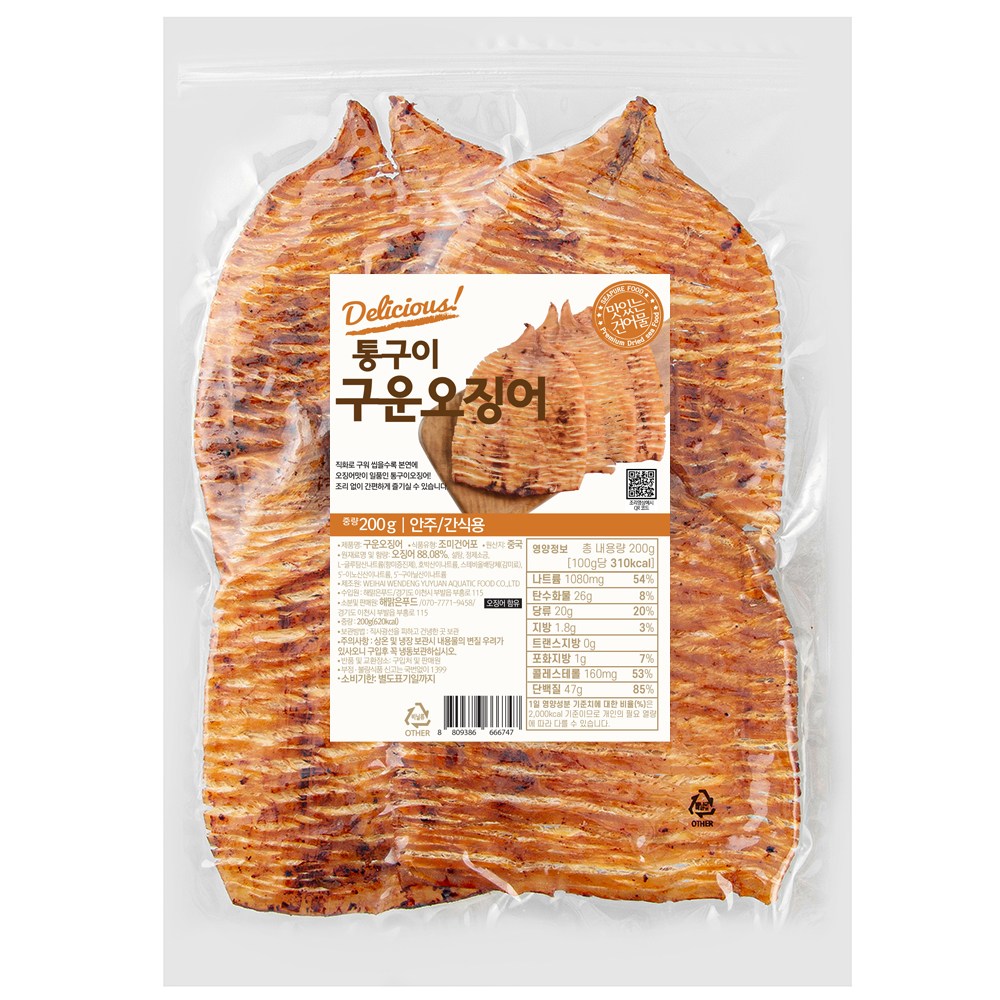 쫄깃쫄깃한 식감으로 즐거움을 선사하는 구운 오징어예요. 결 따라 쭉 찢어 먹으면, 달달하면서도 잡조름한 감칠맛이 입안 가득 퍼진답니다. 시원한 맥주 한 잔에 곁들일 간단한 안주를 찾고 계셨다면 좋은 선택이 될 거예요.
