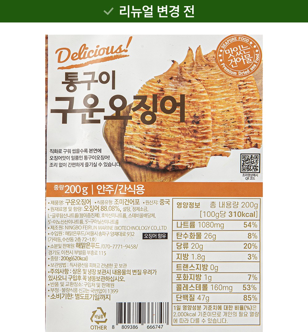 | 생산자 및 소재지 | 리뉴얼 전, 후: 컨텐츠 참조 | 소비기한 또는 품질유지기한 | 소비기한(또는 유통기한) : 2026년 09월 02일 이거나 그 이후인 상품 |