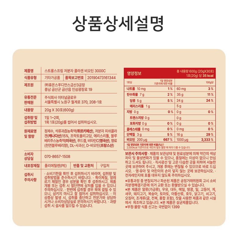 | 원재료명 및 함량 | 정제수, 석류과즙농축액(튀르키예산), 저분자 피쉬콜라겐(캐나다산)15%, 프락토올리고당, 에리스리톨, 블루베리주스농축액(미국산), 푸드겔, 비타민C(영국산),향료(천연블루베리향료), DL-사과산, D-비오틴(프랑스산) | 영양성분 | 상품 상세페이지 참조 |