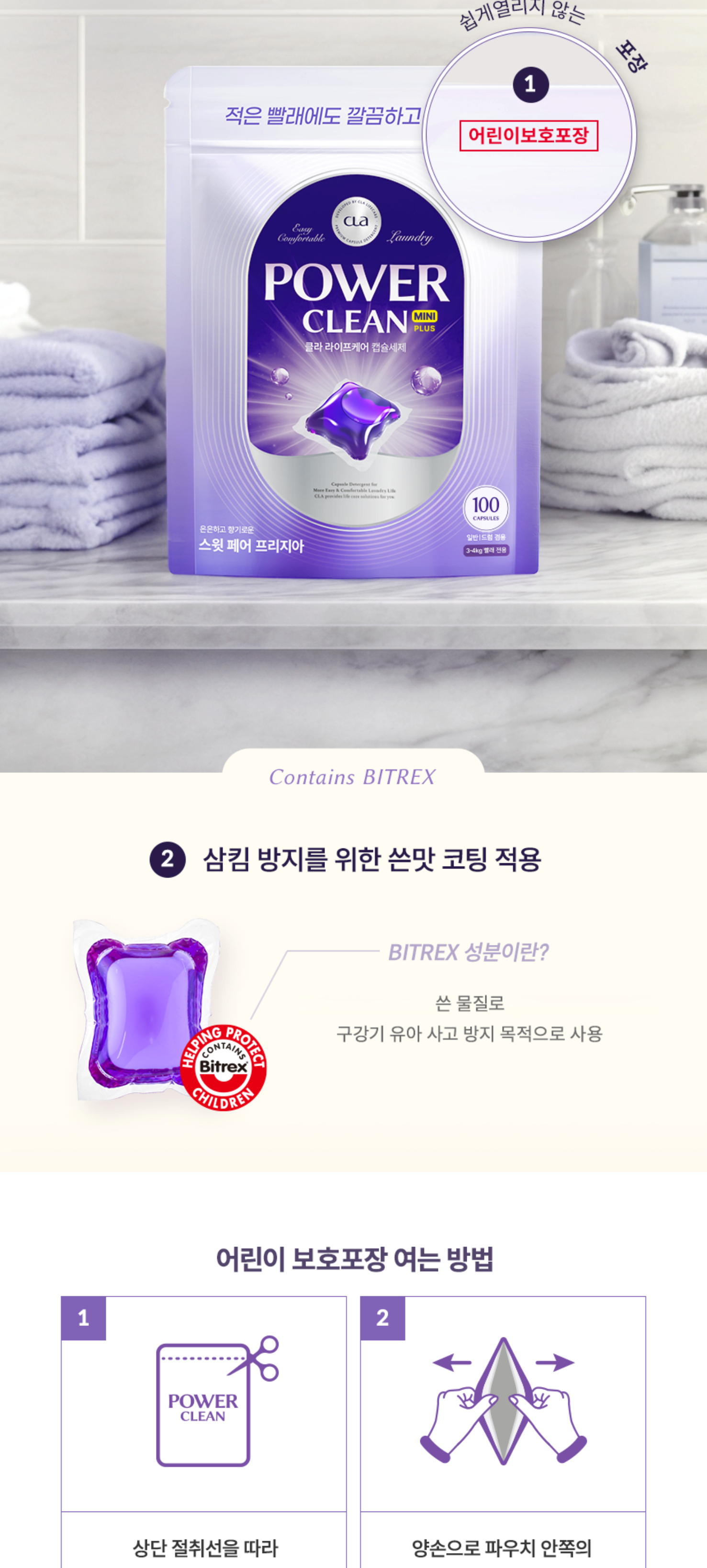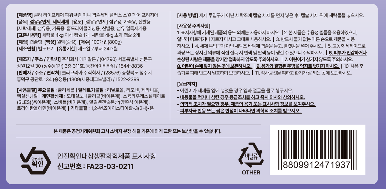 | 품목 및 제품명 | 섬유유연제, 세탁세제 / 클라 라이프케어 파워클린 미니 캡슐세제 플러스 스윗 페어 프리지아 | 용도(표백제의 경우 계열을 함께표시) 및 제형 | 세탁세제-가죽용, 섬유 얼룩제거용, 섬유용, 신발용, 홈드라이클리닝용 | 섬유유연제-가죽용, 섬유용, 신발용 / 캡슐형 |